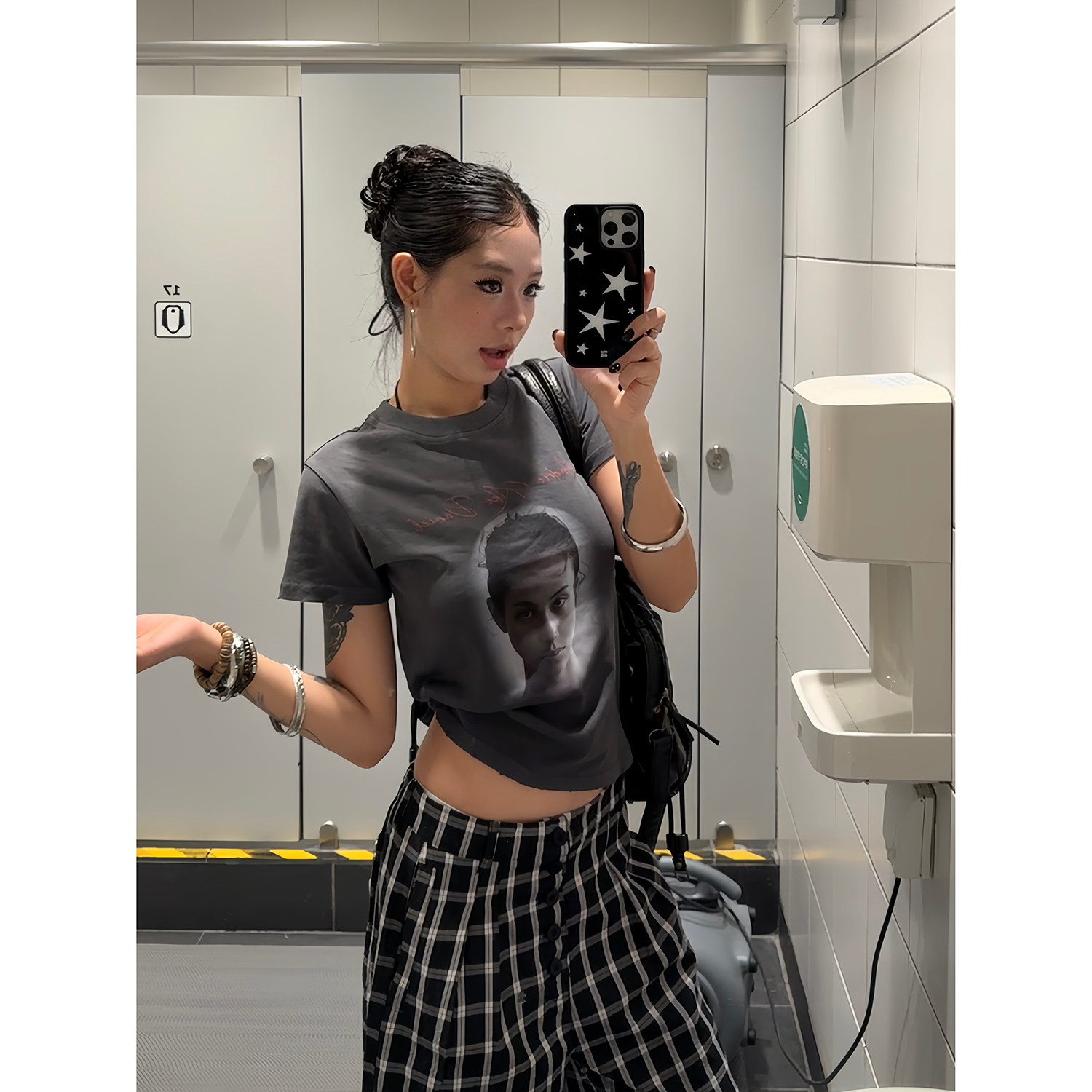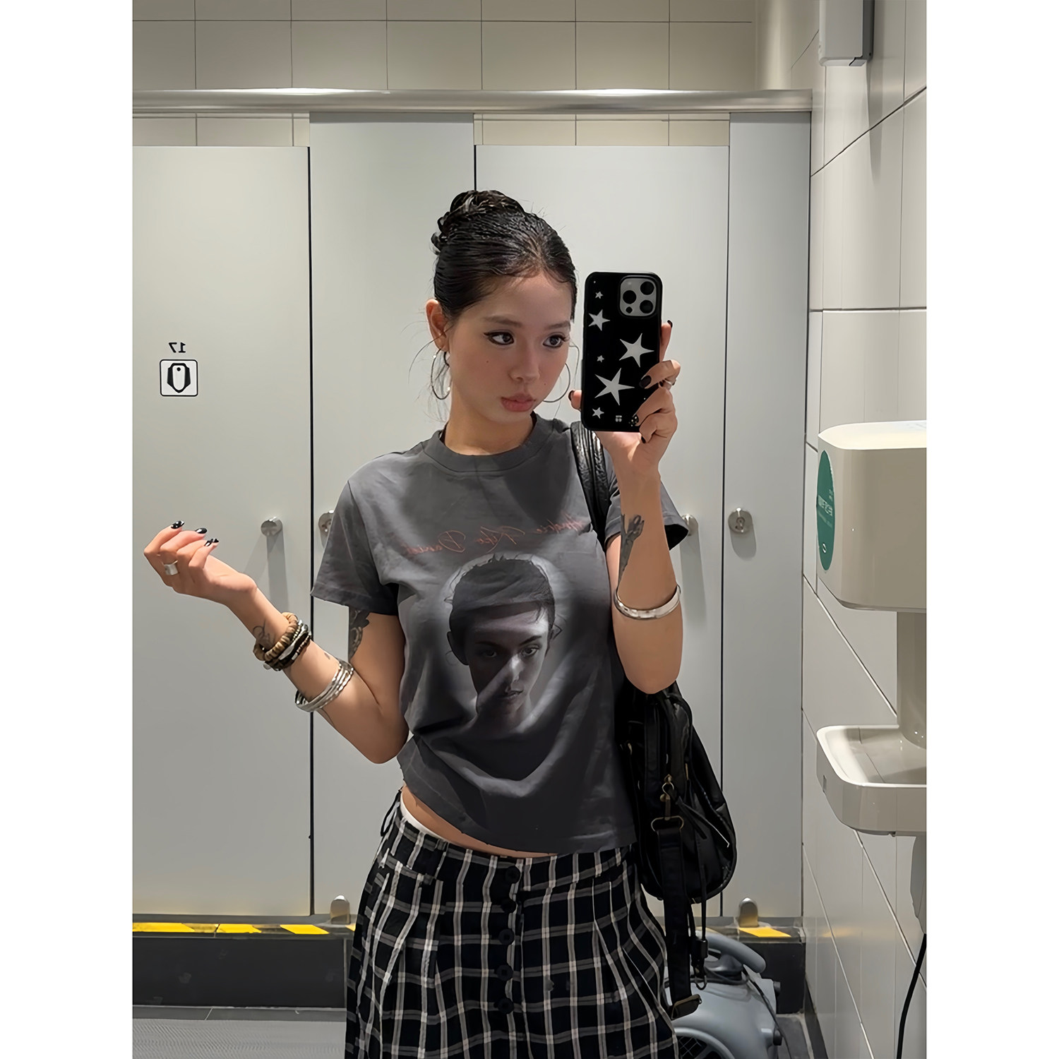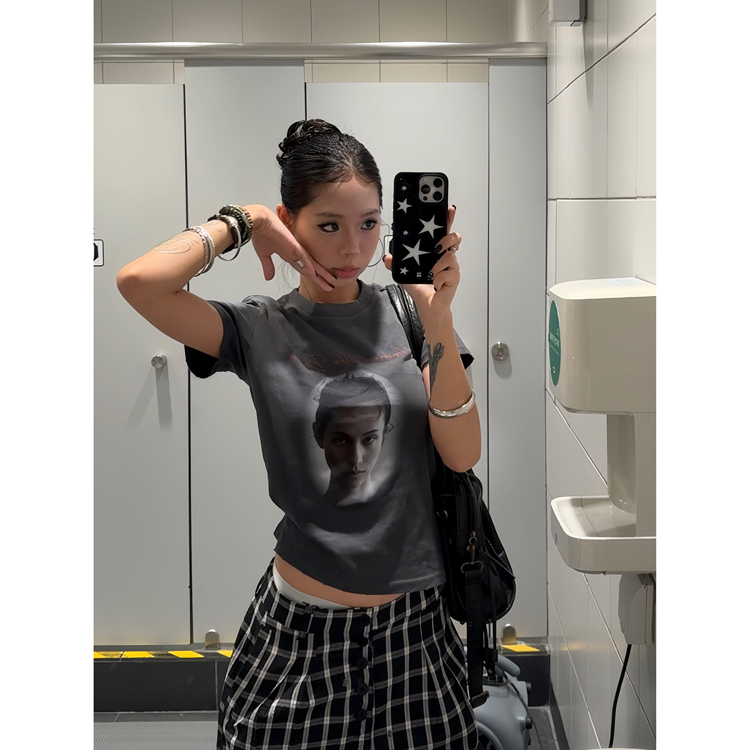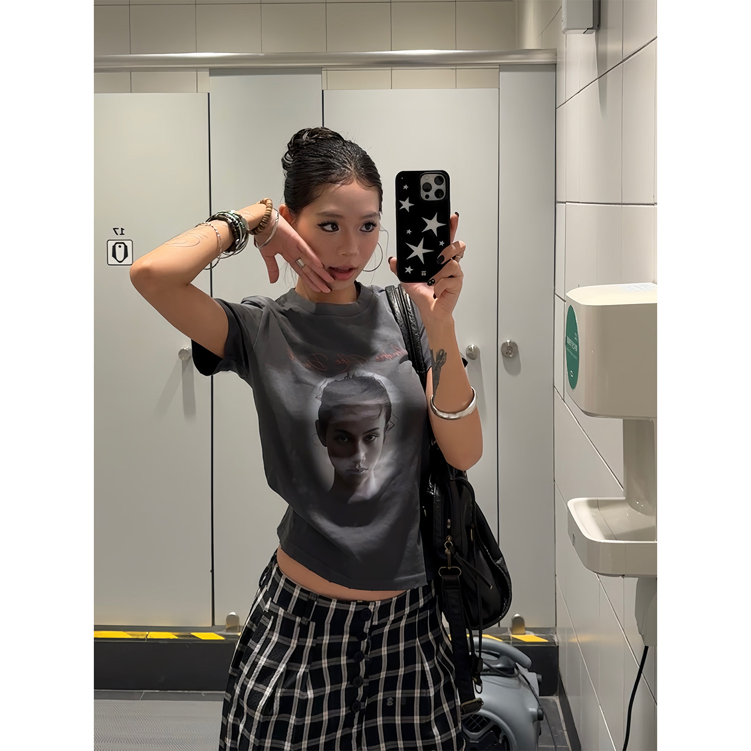 2025美式 短款 复古百搭短袖 辣妹修身 上衣 人像印花T恤女夏美式 F383