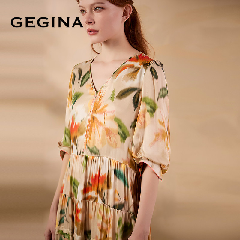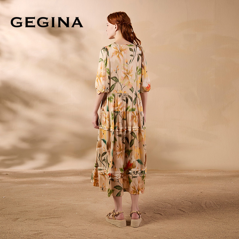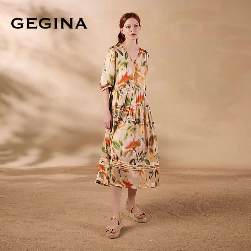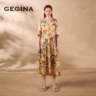 GEGINA吉吉娜夏季 V领印花连衣裙海边度假风气质时髦长裙 新品