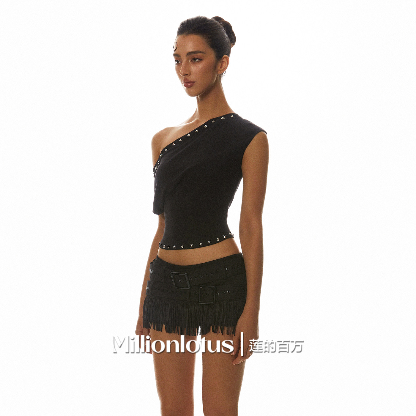 铆钉设计辣妹T恤重工腰带流苏半裙套装 莲 百万