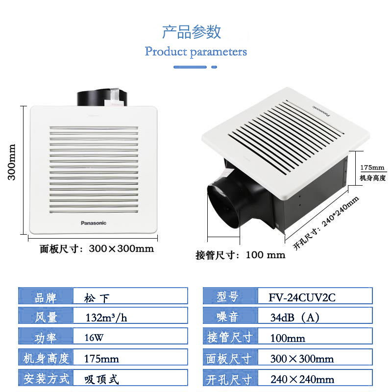 松下排气扇厨房卫生间管道换气扇铝扣板吸顶静音天埋扇FV24CUV2C