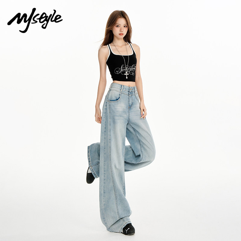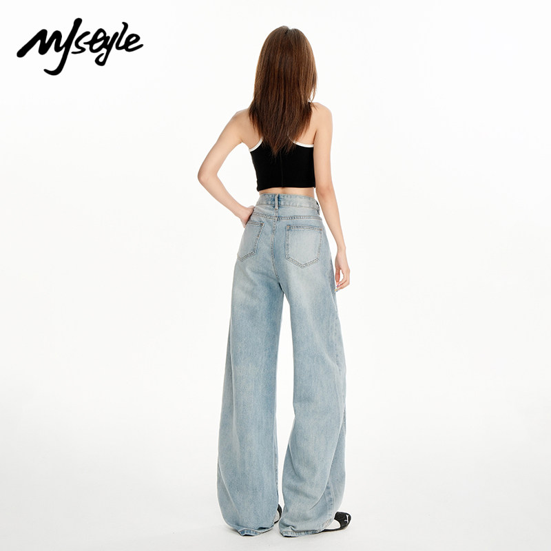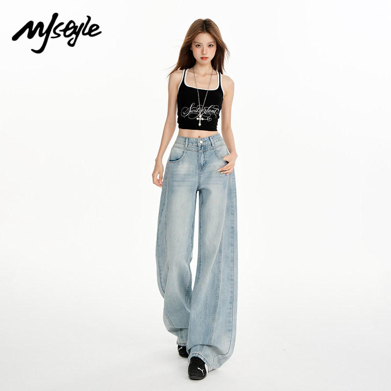 STYLE浅蓝色弯刀冰丝牛仔裤 高腰宽松直筒阔腿裤 女夏季 美式 新款