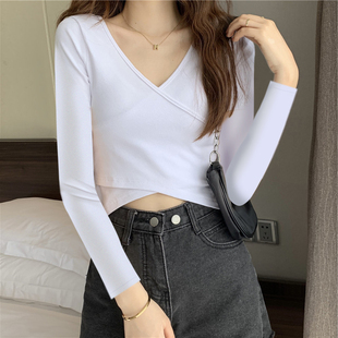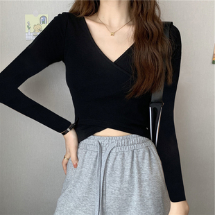 2025新款 长袖 春装 t恤紧身高腰纯色设计感小众短款 上衣 v领短袖 女装