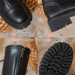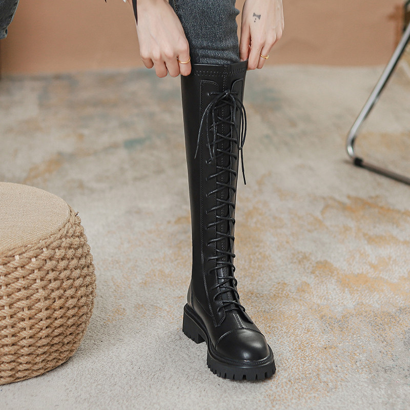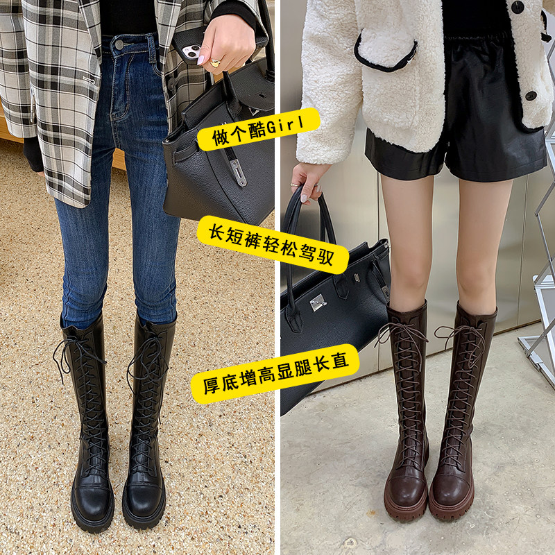 真皮长筒靴女不过膝2023新款 秋冬骑士靴小个子厚底显瘦系带高筒靴