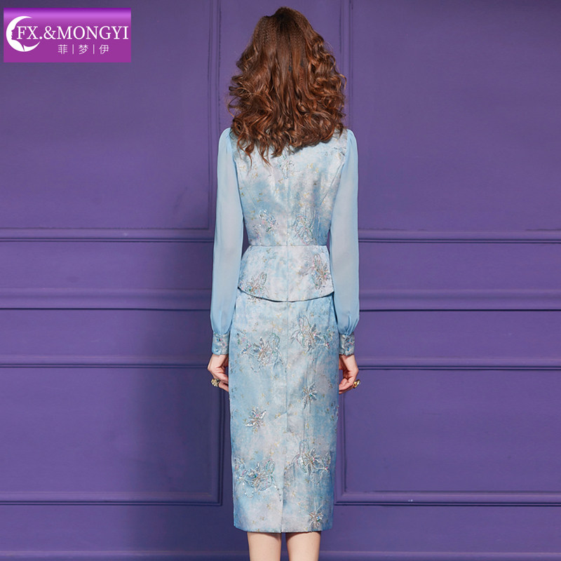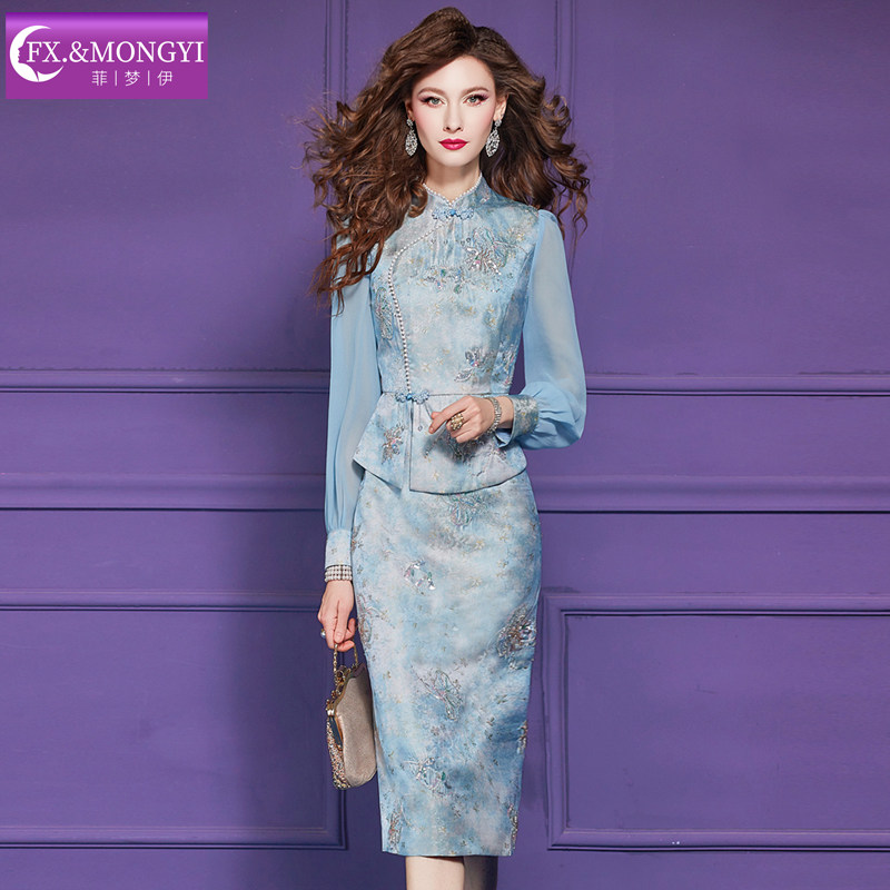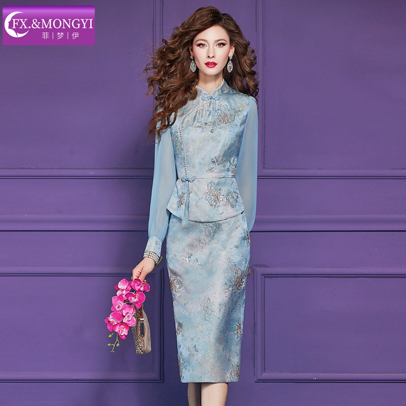 国风立领改良旗袍裙 新中式 菲梦伊钉珠绣花蓝色连衣裙女春季 年轻款