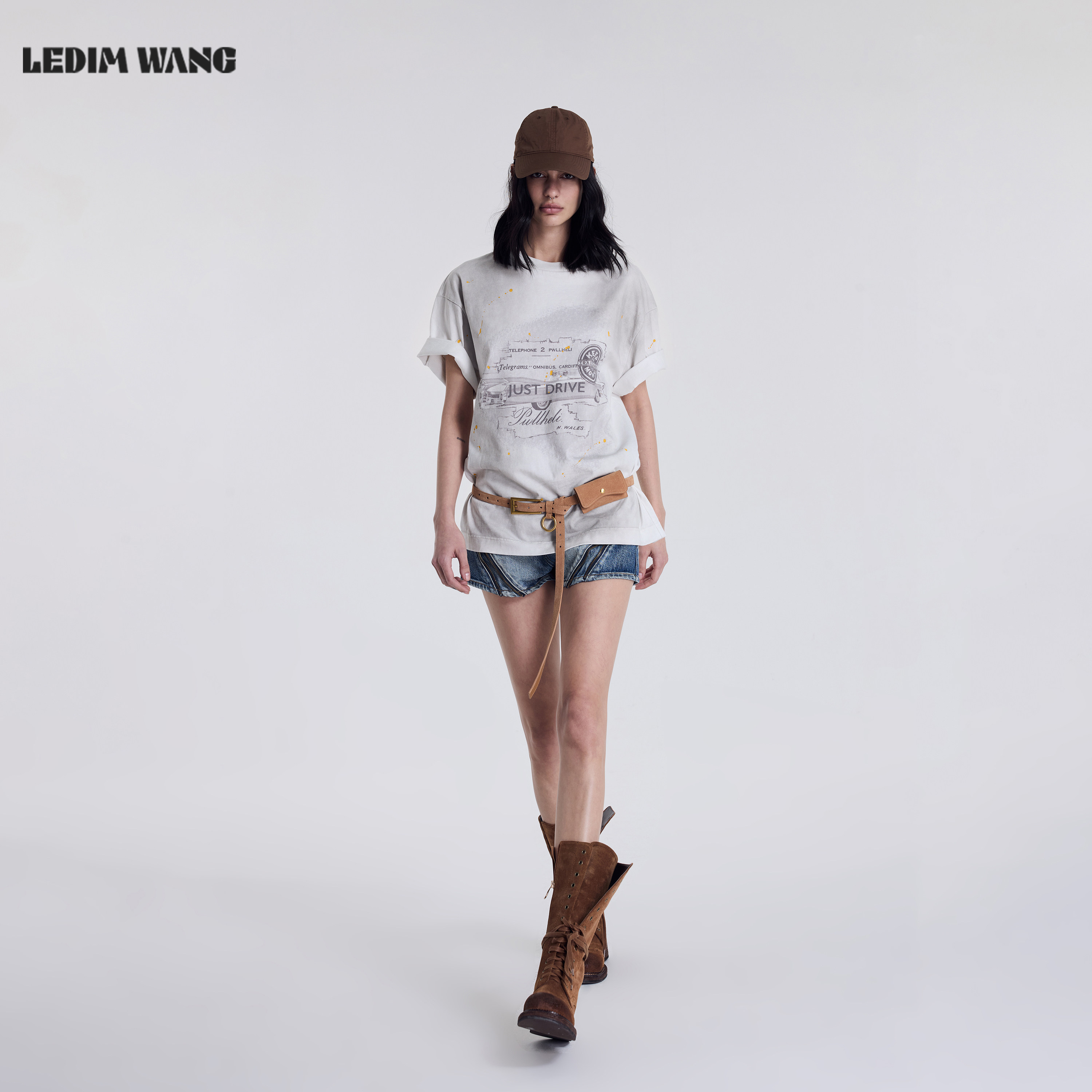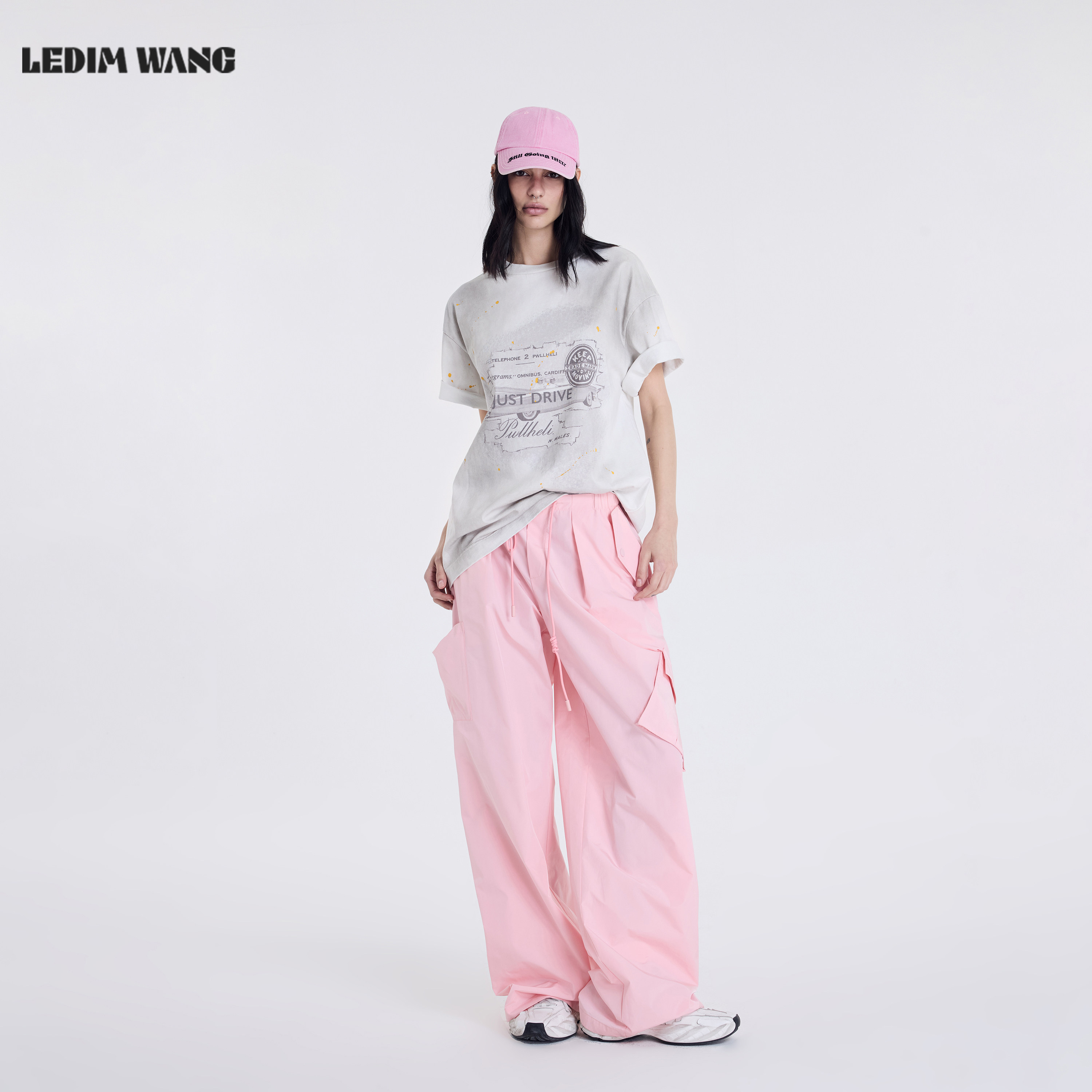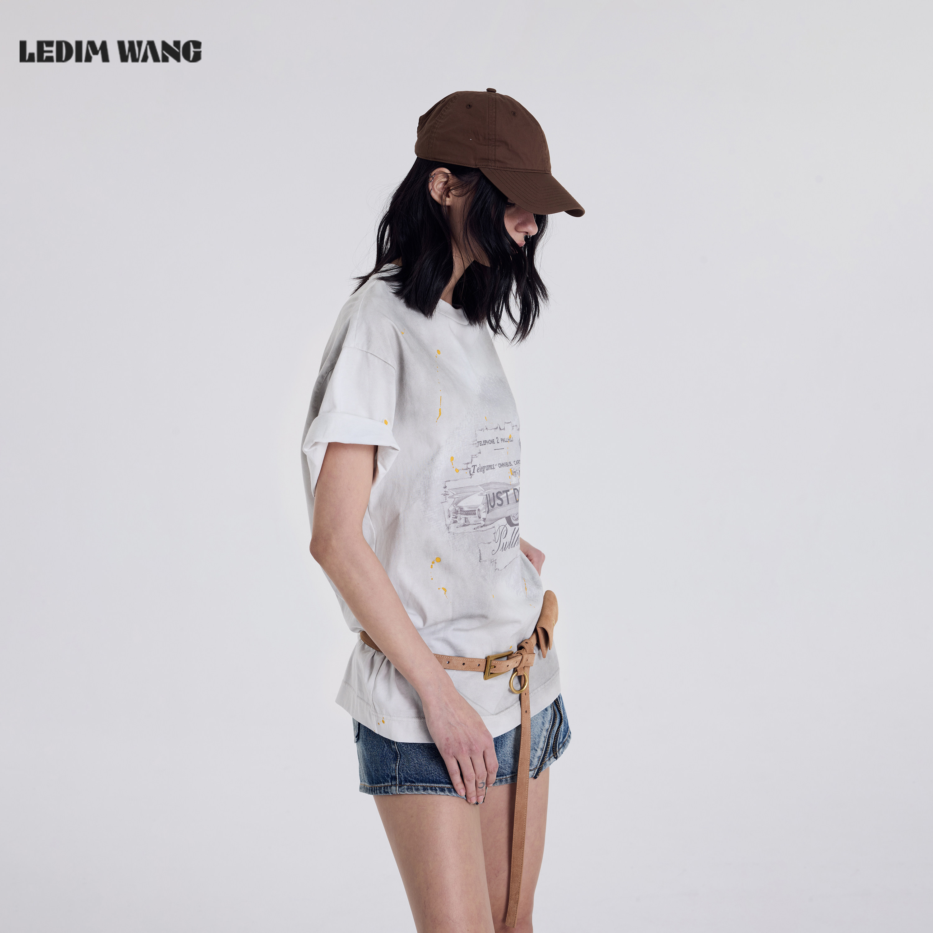 上衣 纯棉水洗直筒宽松短袖 LEDIM WANG灰白泼墨T恤女2026春夏新款
