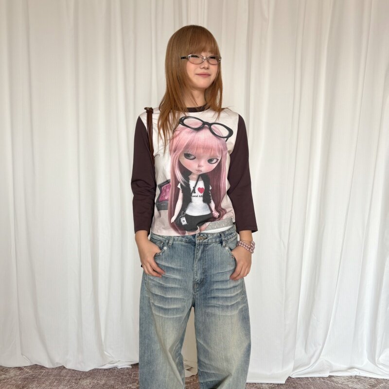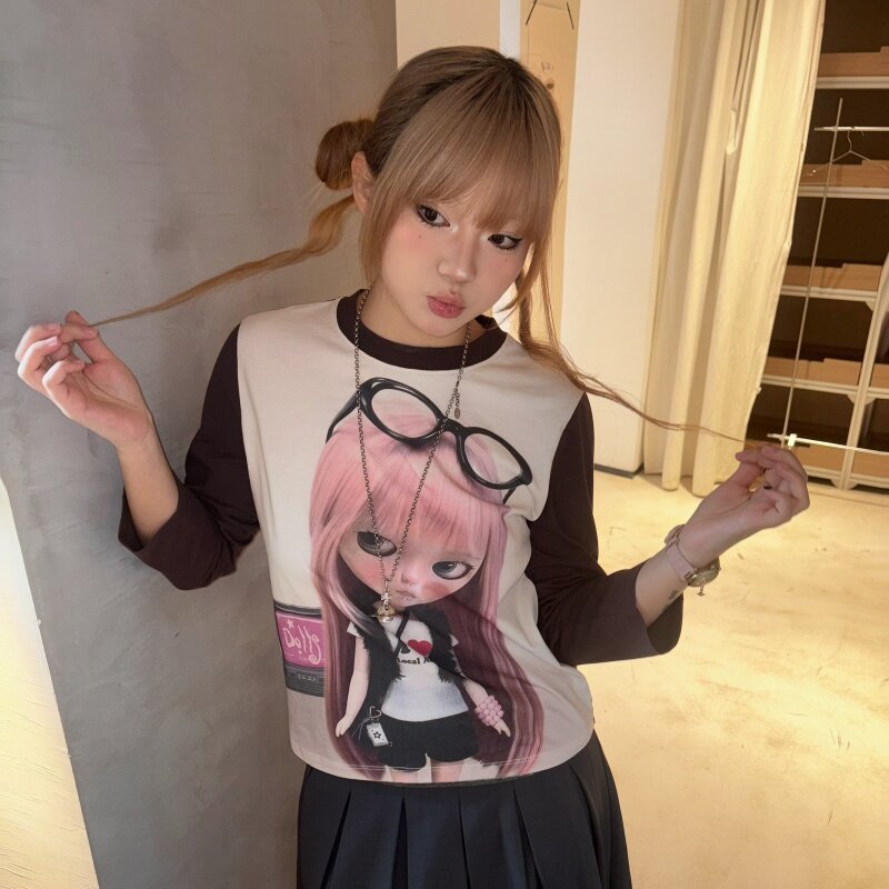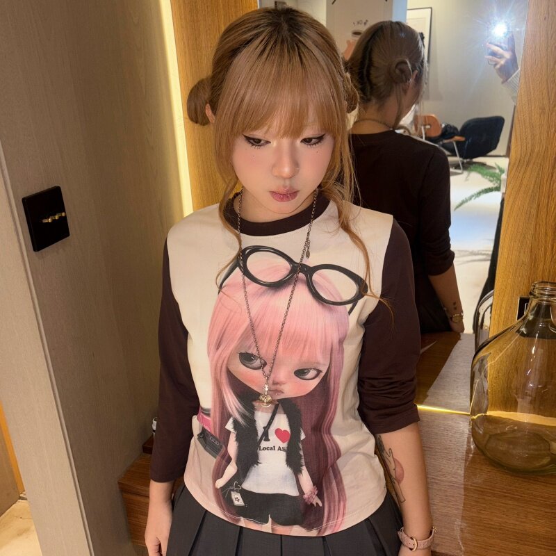拼接七分袖 复古大头娃娃印花短袖 t恤 aliens外星沙龙美式 local