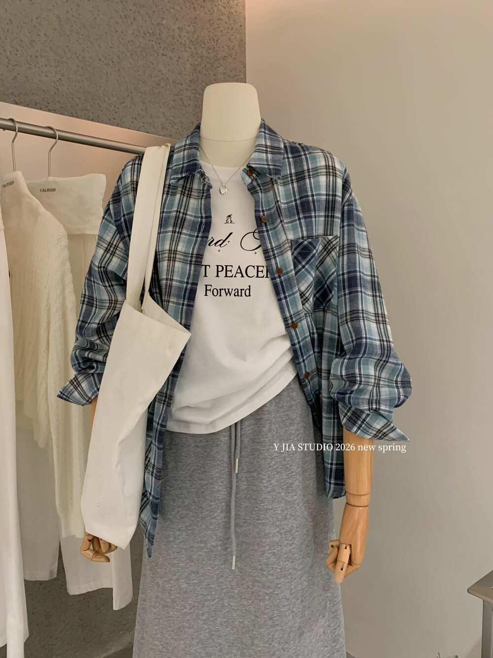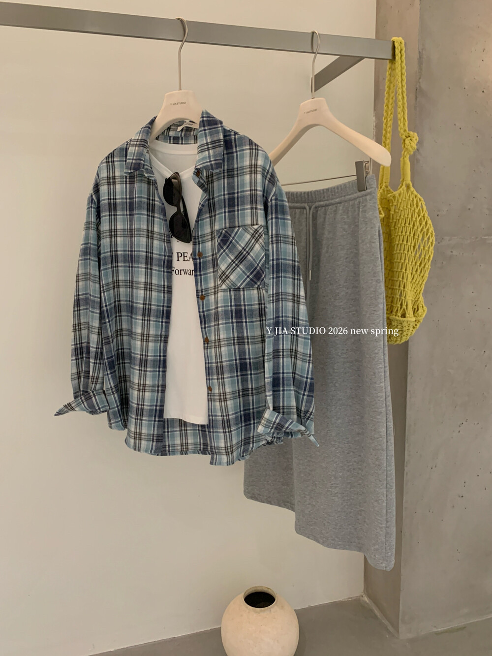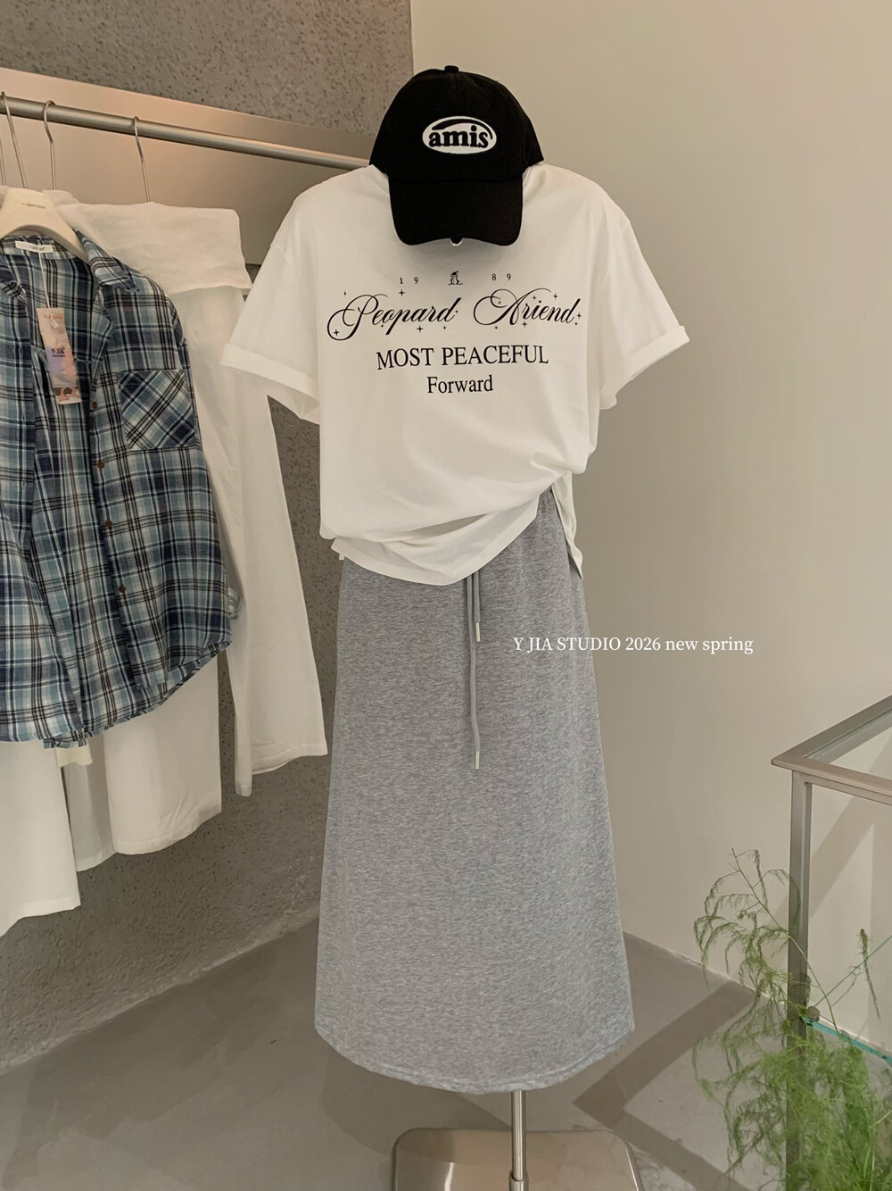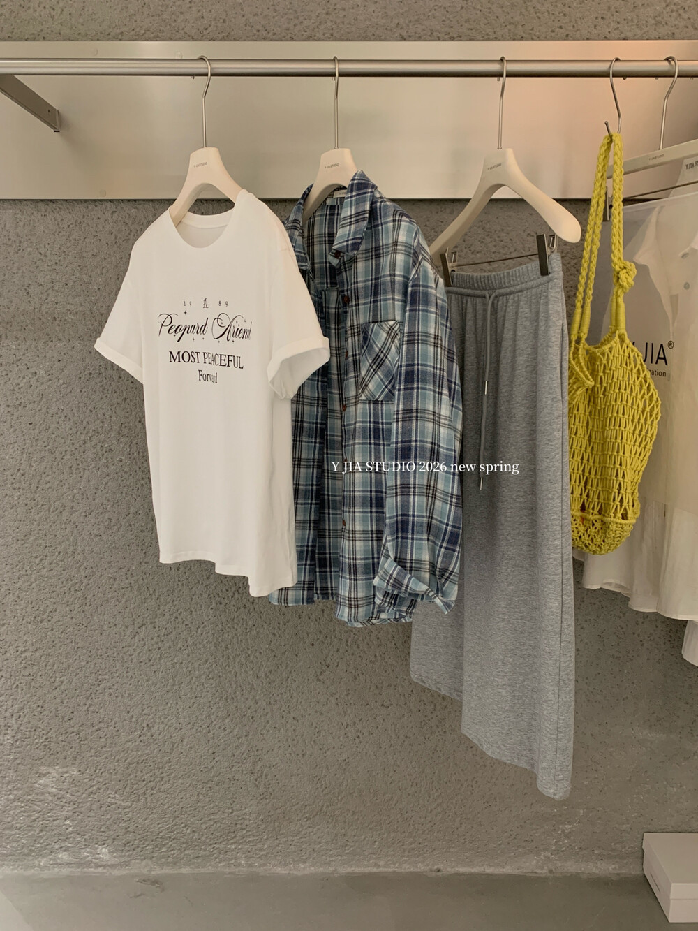 灰色半身裙卫裙三件套装 Y.JIA伊嘉春夏宽松休闲格子衬衫 字母T恤