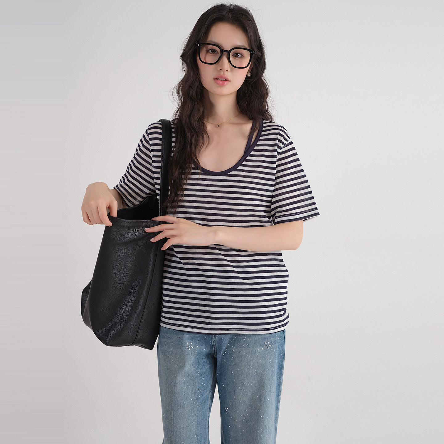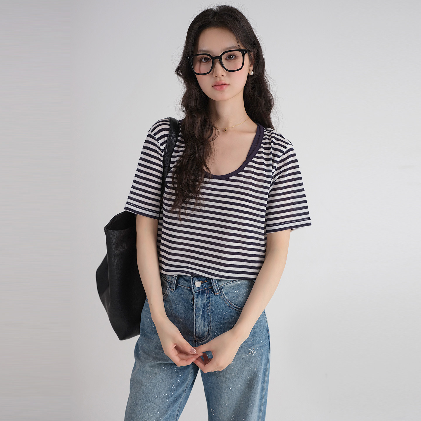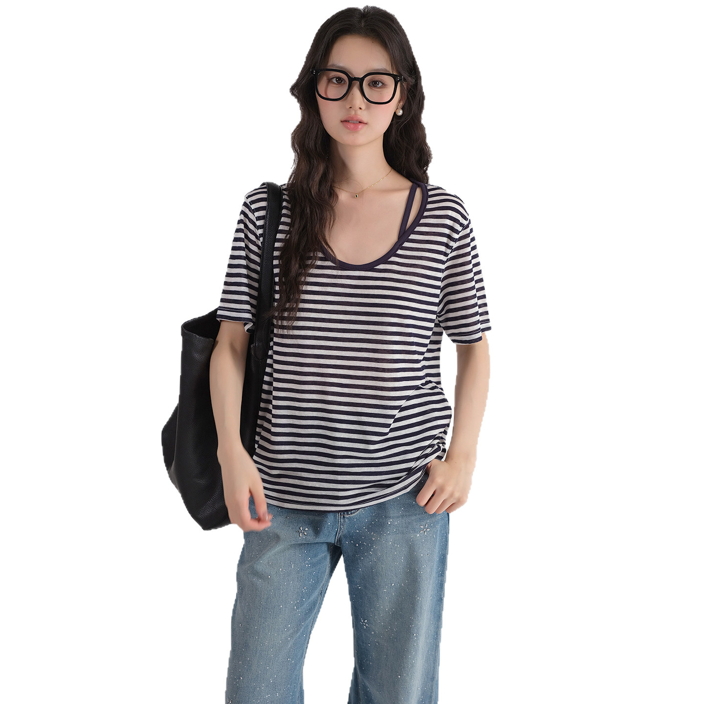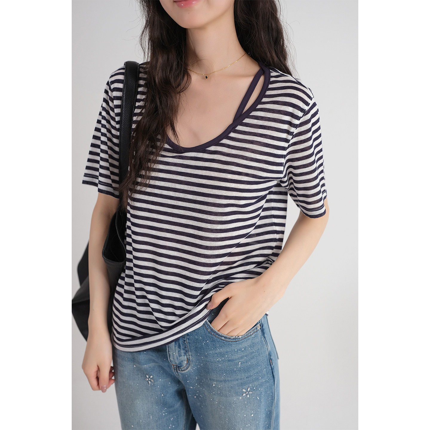 新款 2026夏装 假两件条纹U领上衣胖MM慵懒遮肚子T恤 女装 蓝若水大码