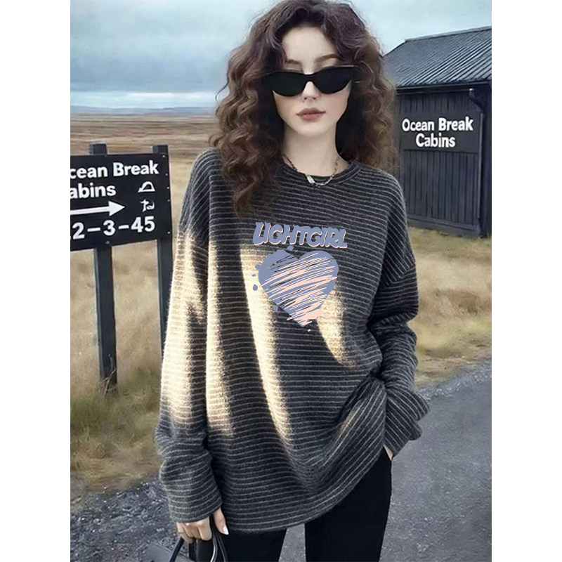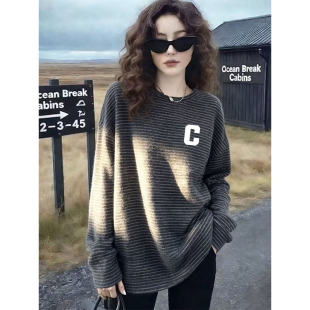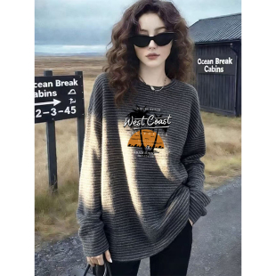 女德绒保暖洋气宽松条纹设计感打底衫 圆领长袖 上衣 中长款 2026新款