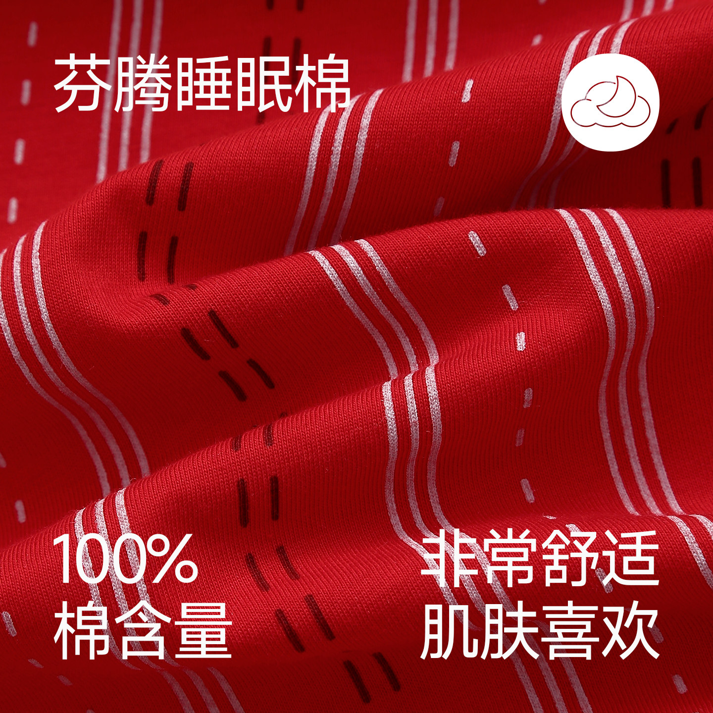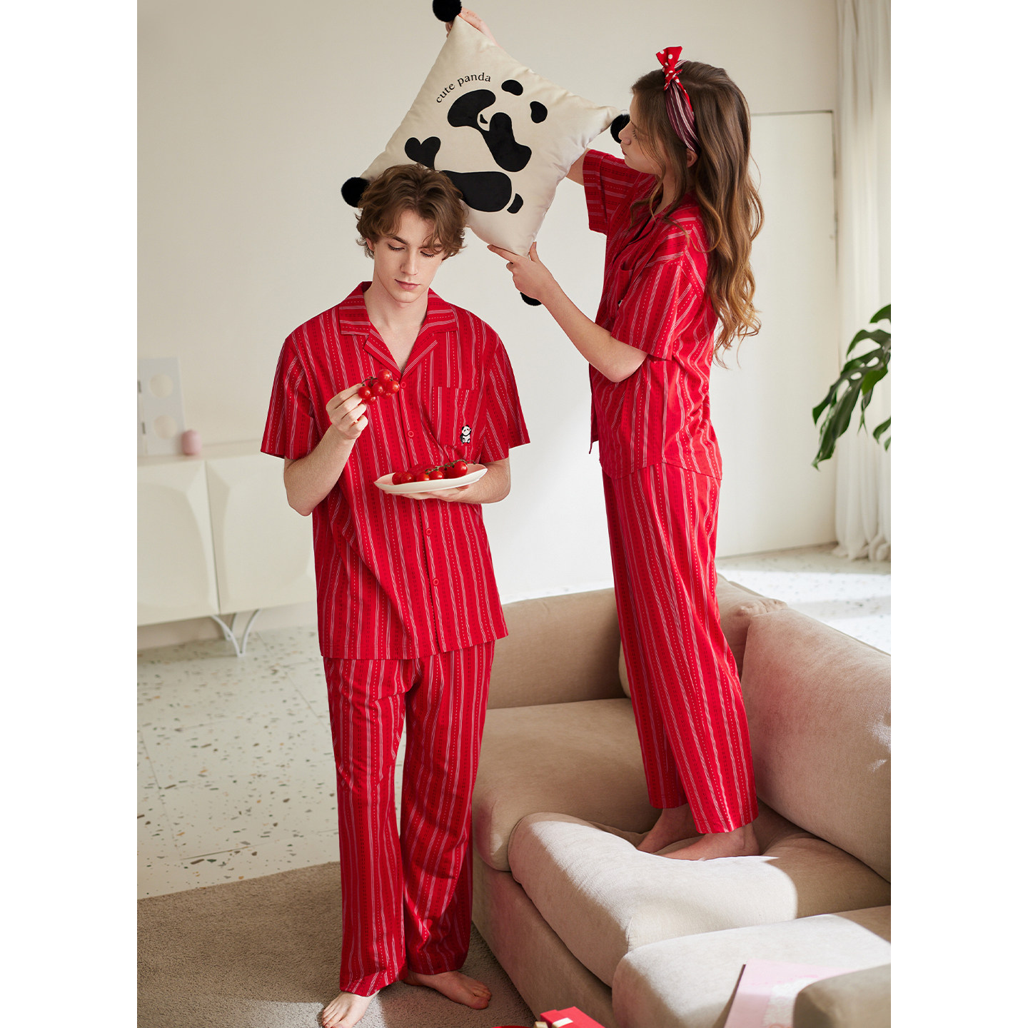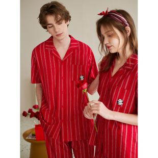 红色喜庆宽松舒适男女款 套装 家居服 纯棉条纹短袖 芬腾情侣睡衣夏季