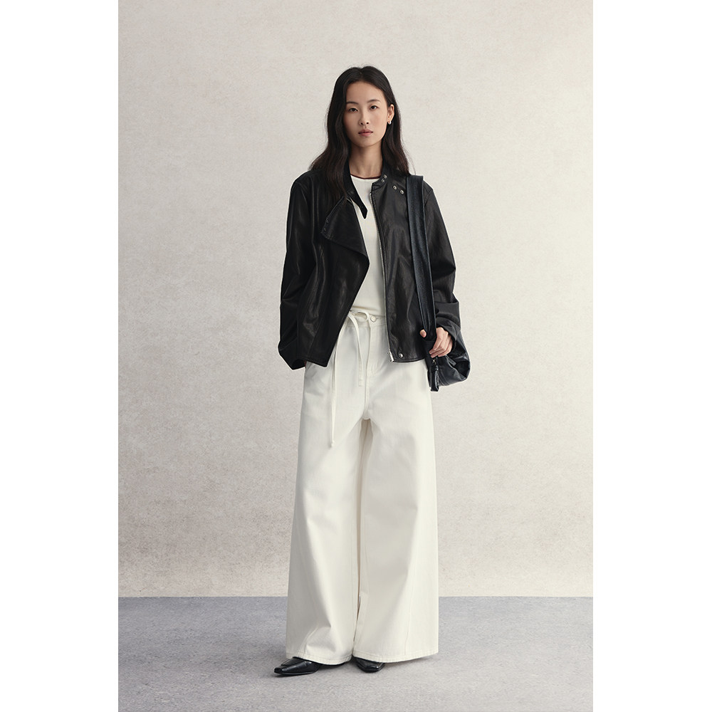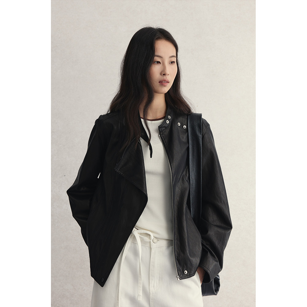 酷飒皮衣短款 复古斜片式 CAREMIND美式 百搭夹克外套秋 黑曜皮衣