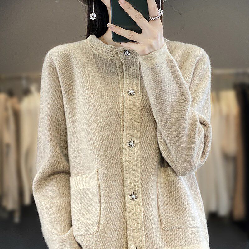 女拼色毛衣撞色羊毛衫 开衫 外套宽松上衣 圆领100%羊绒衫 24秋冬新款