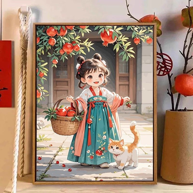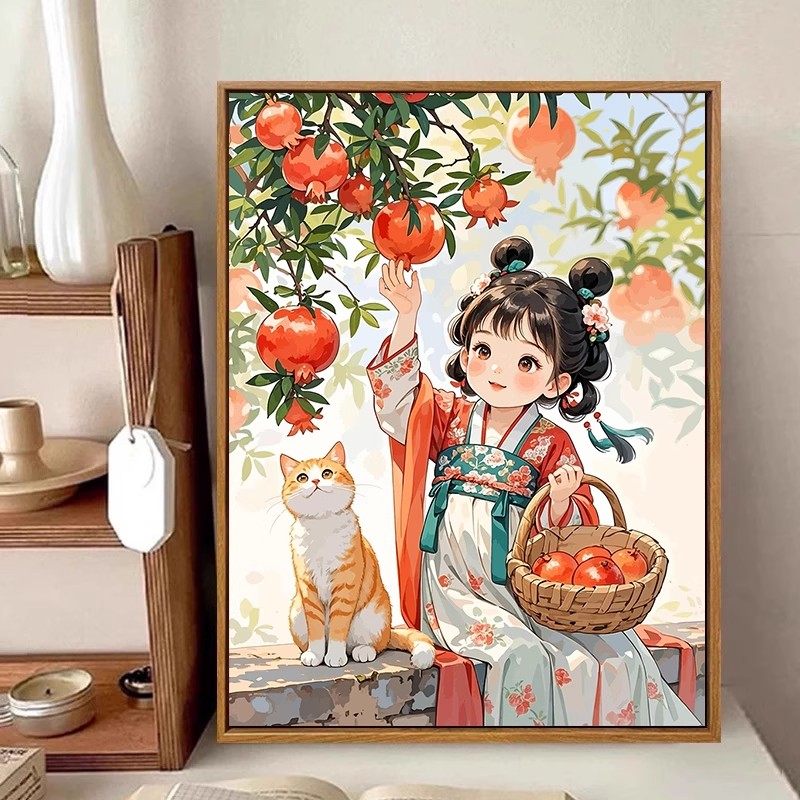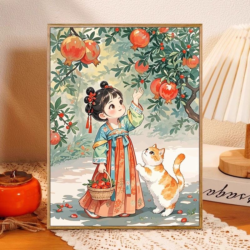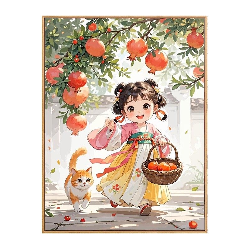 饰画仿油画人物唯美可爱卧室客厅摆挂画 成品装 新中式 石榴女孩古装