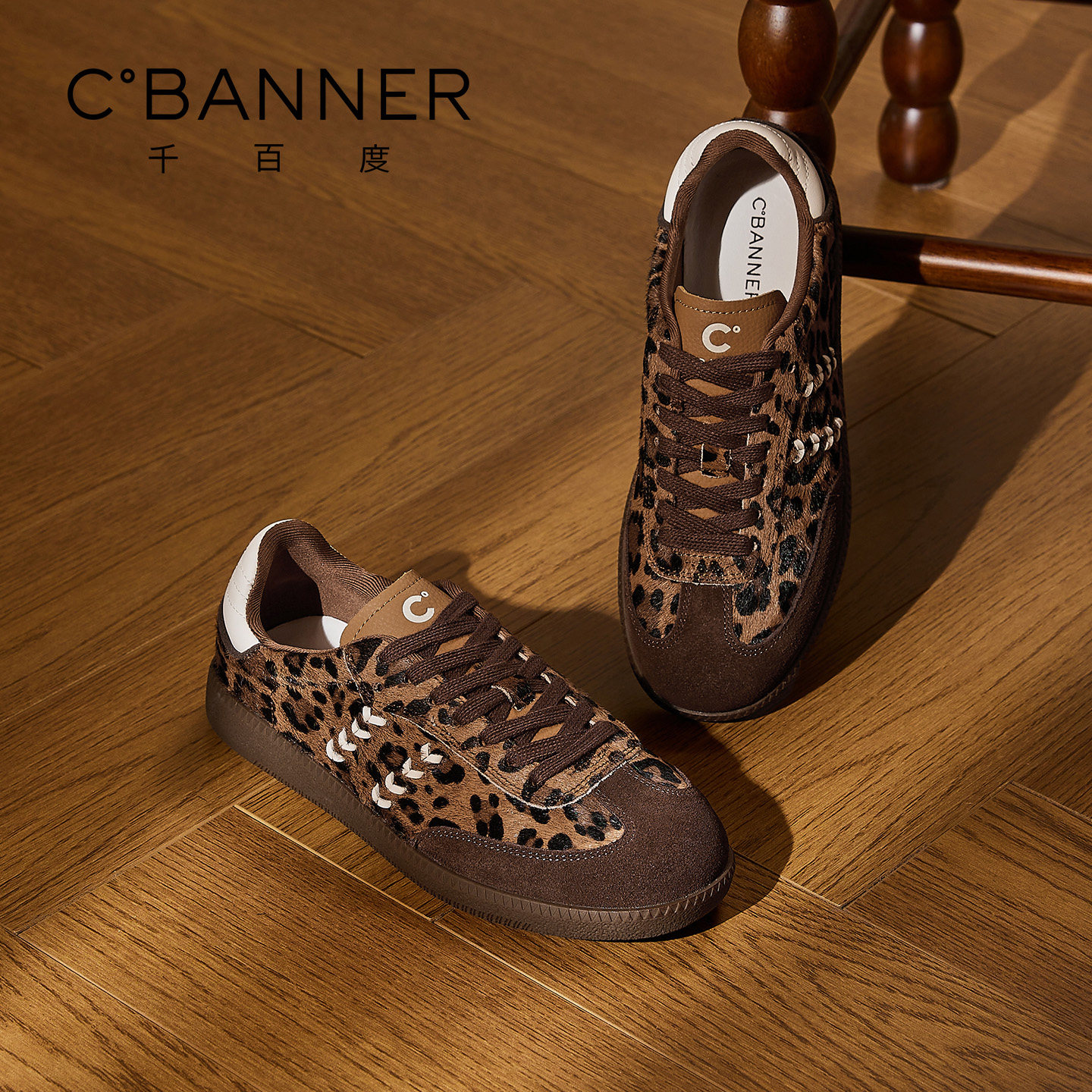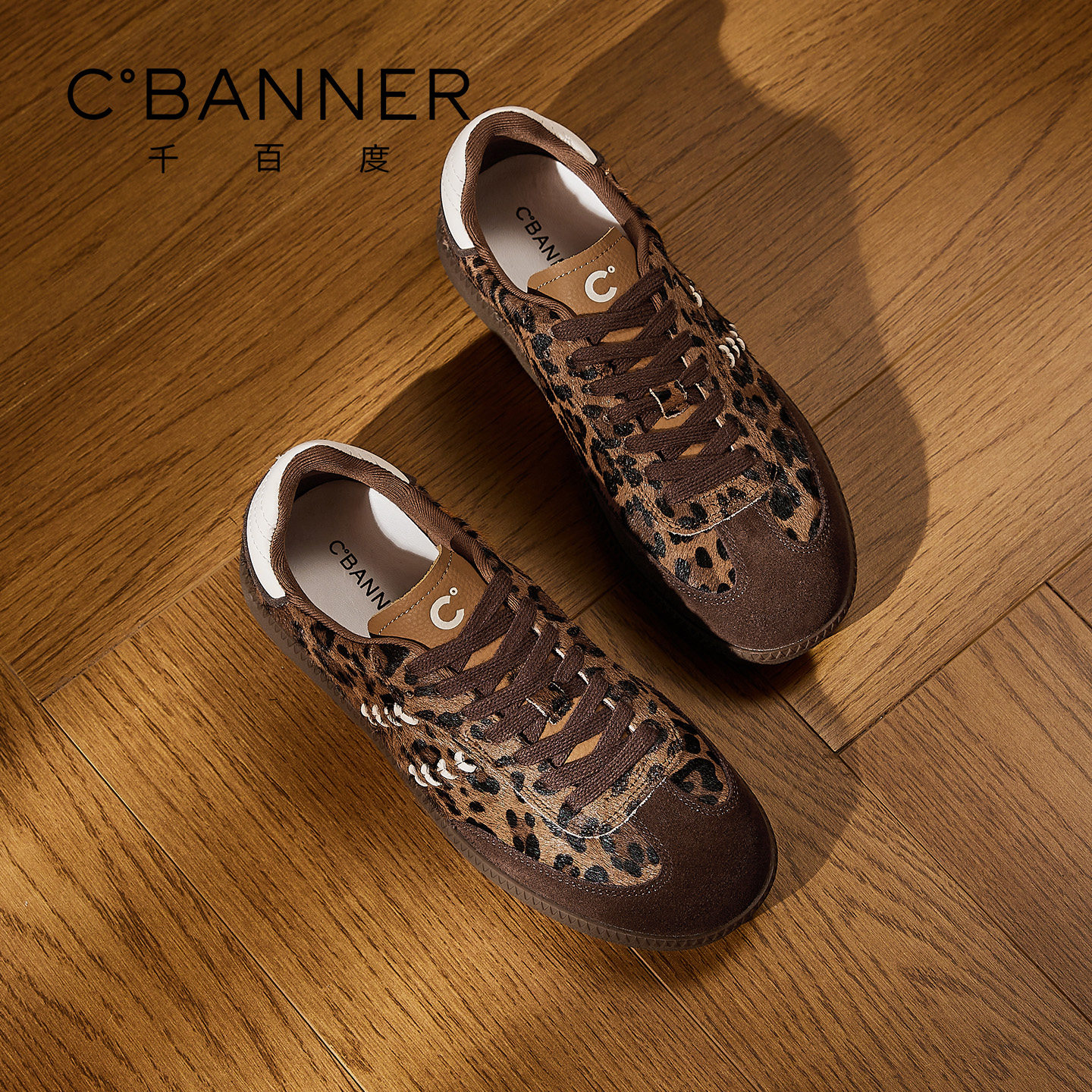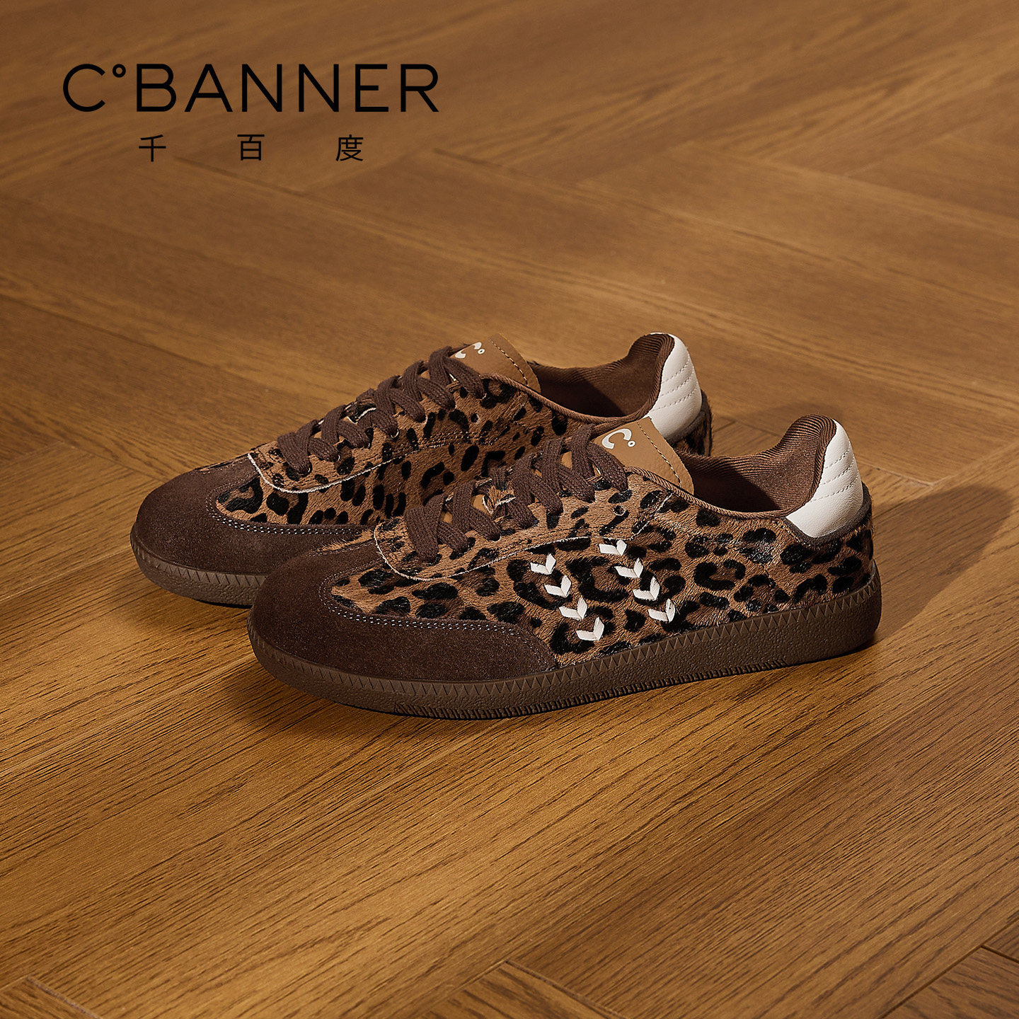 平底板鞋 复古百搭休闲鞋 子女 女系带松糕新款 千百度真皮豹纹德训鞋