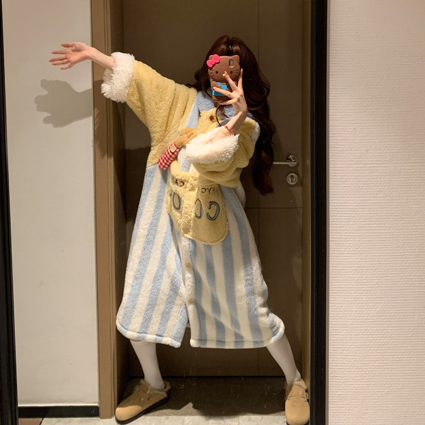 秋冬 法兰绒可外穿卡通少女连帽睡衣家居服套装 亲嘴猫 蜡笔小新