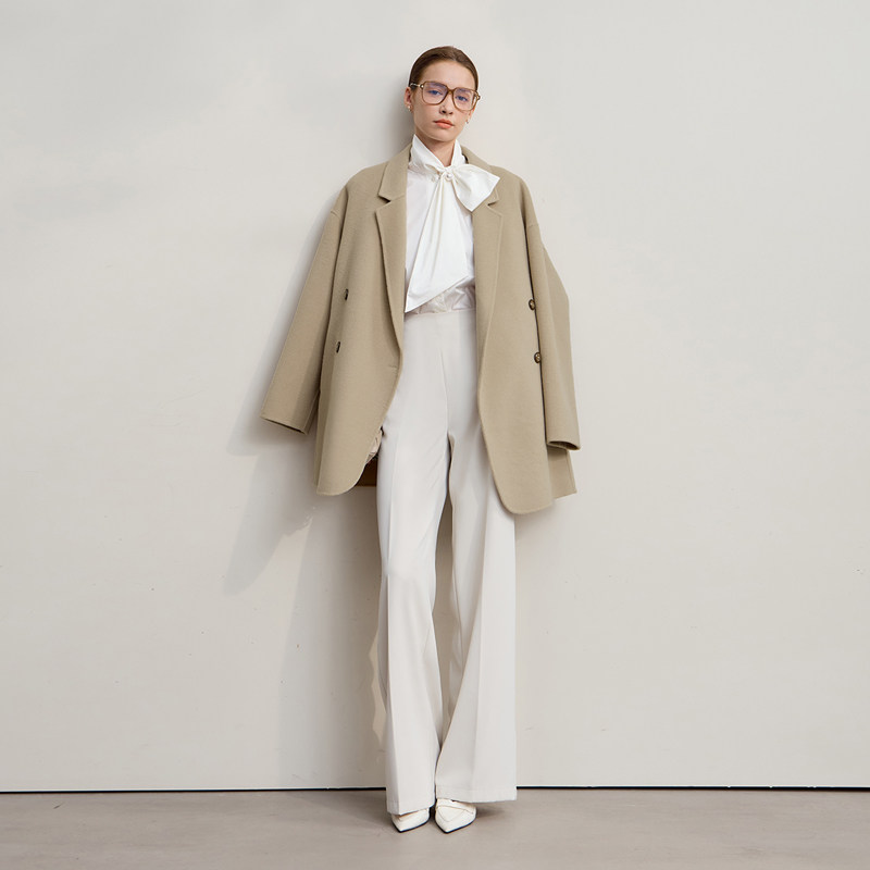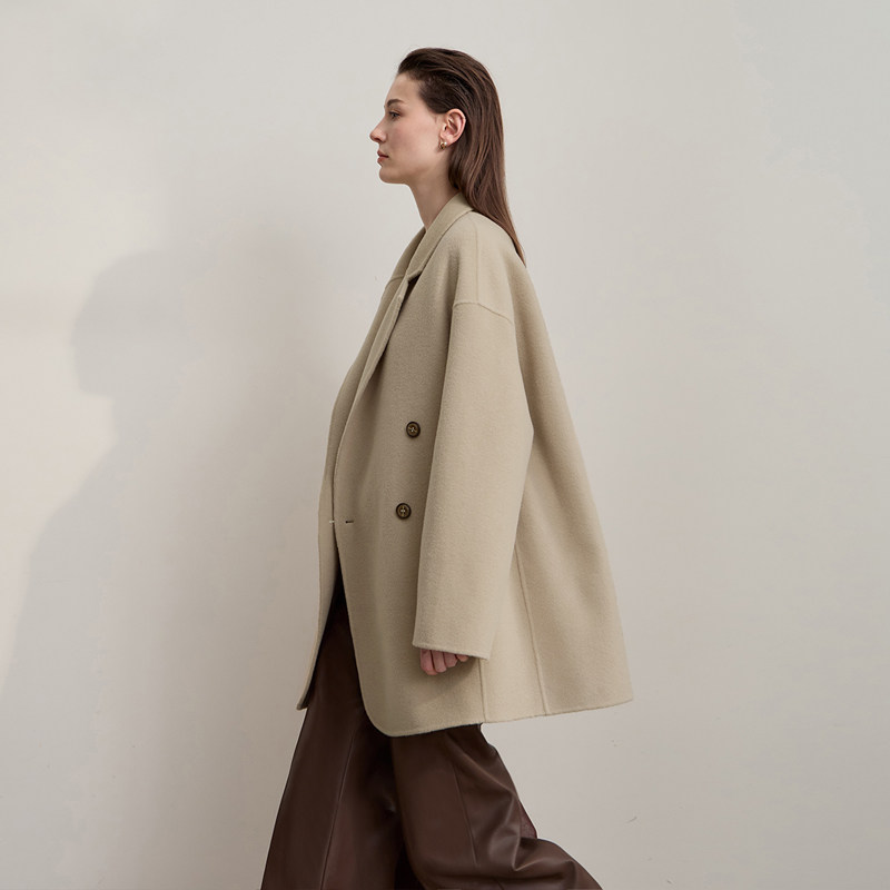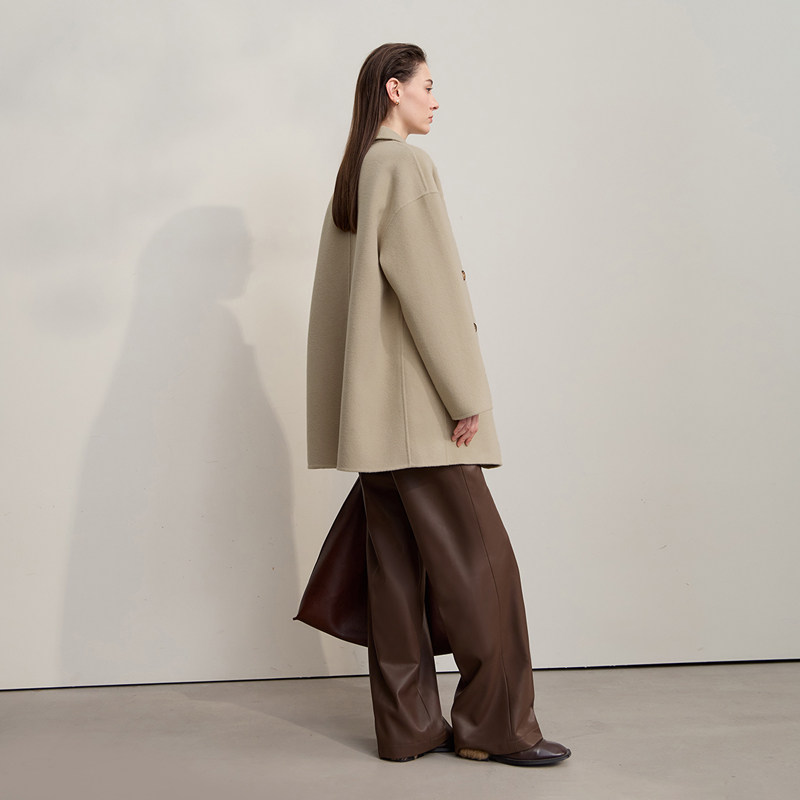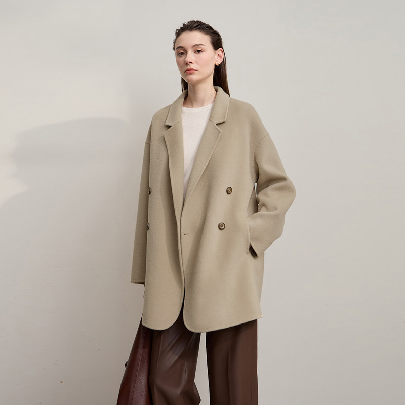 Amii2025冬新款 全羊毛双面呢外套 轻奢宽松中长双排扣翻领落肩袖