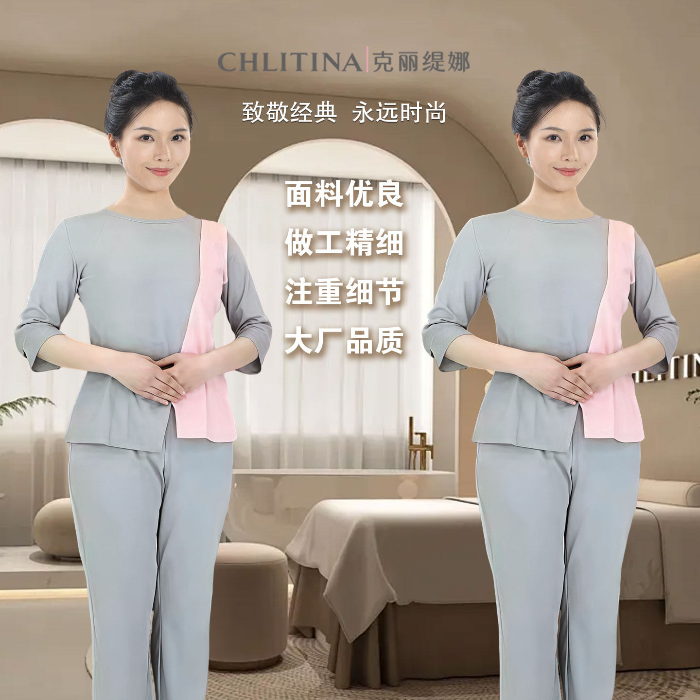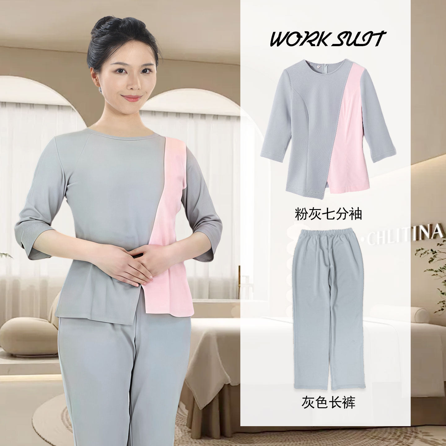 美容院工装 美容师护理操作服七分袖 2025款 克丽缇娜工作服女套装