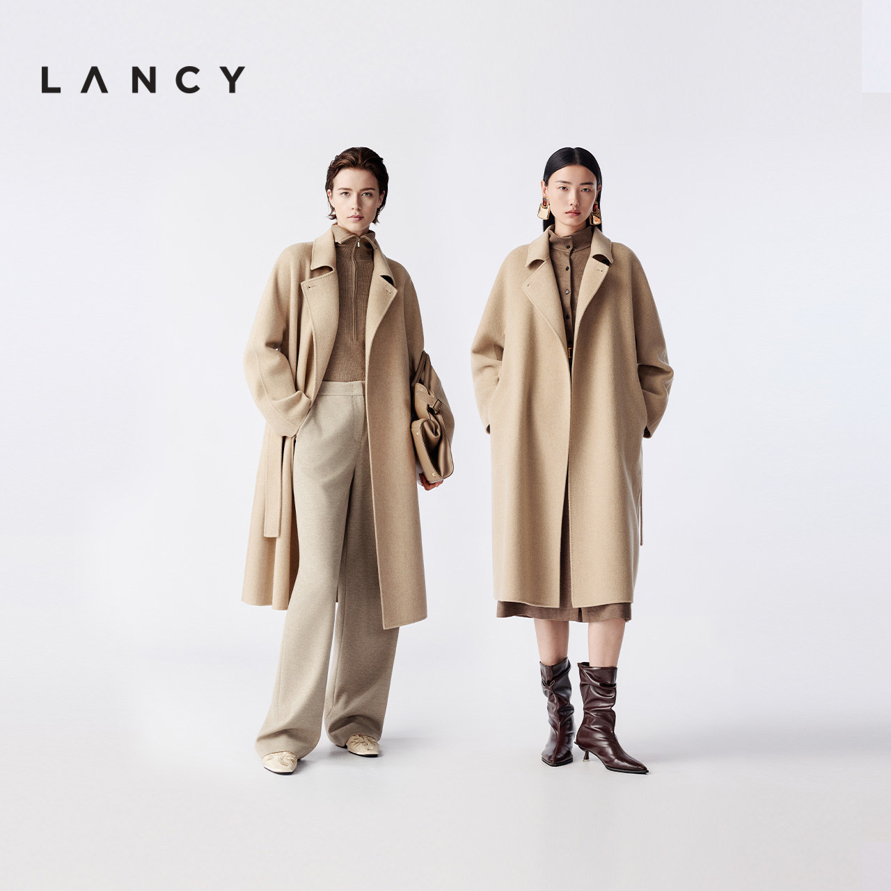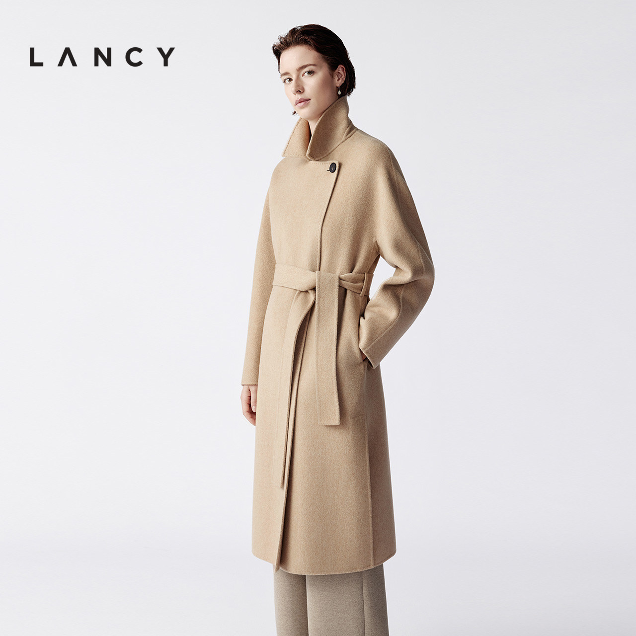 IHIMI海谧双色两穿100绵羊毛荡领毛呢大衣冬女季 外套 牛角扣中长款