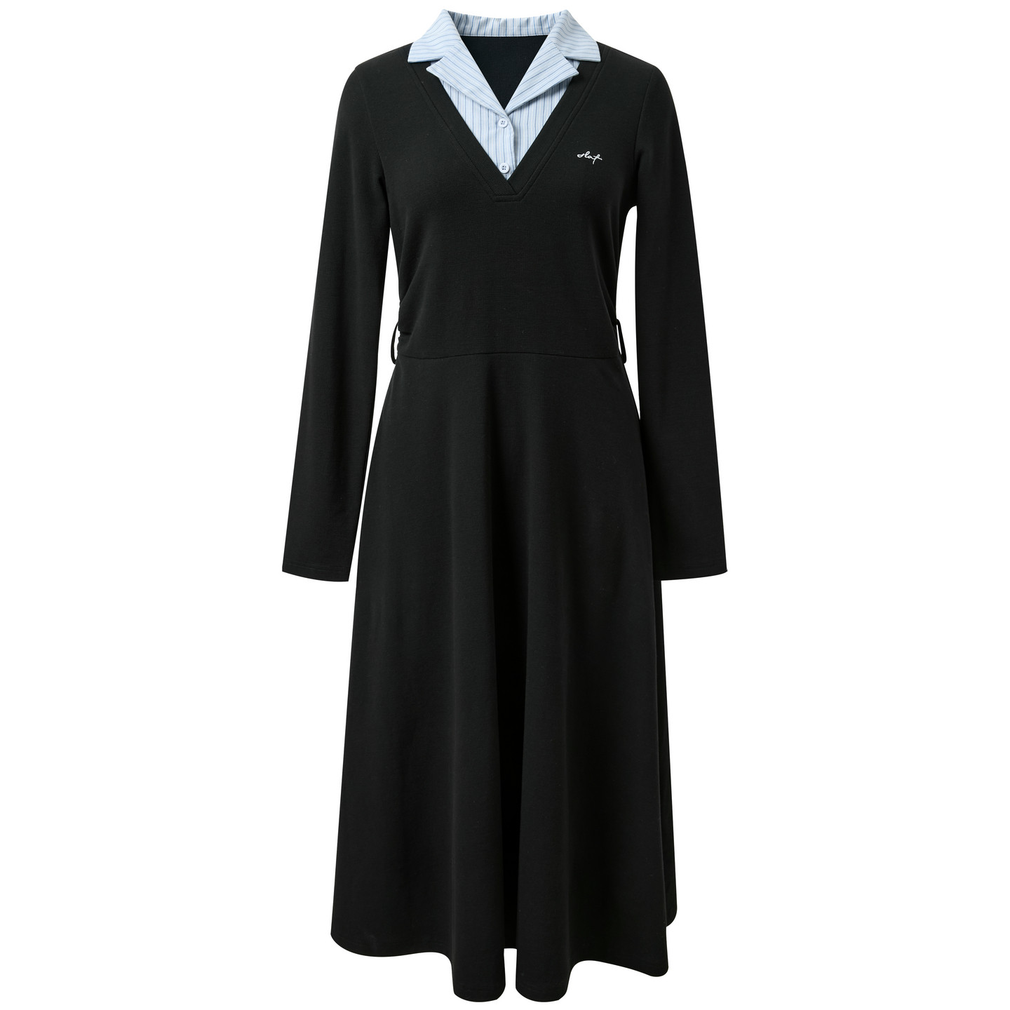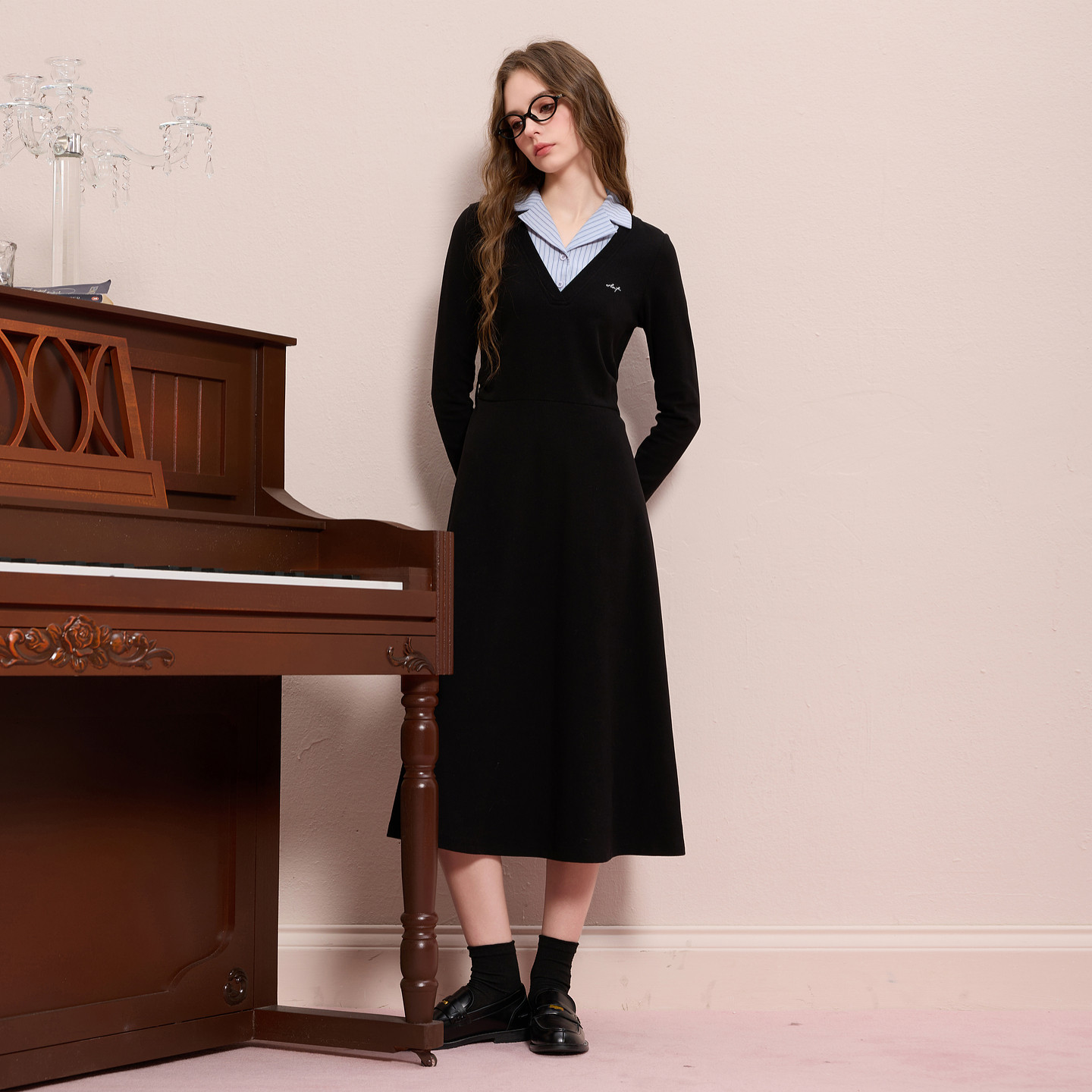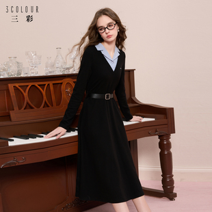 三彩2025冬季 假两件连衣裙刺绣收腰A字裙长裙M女 新款