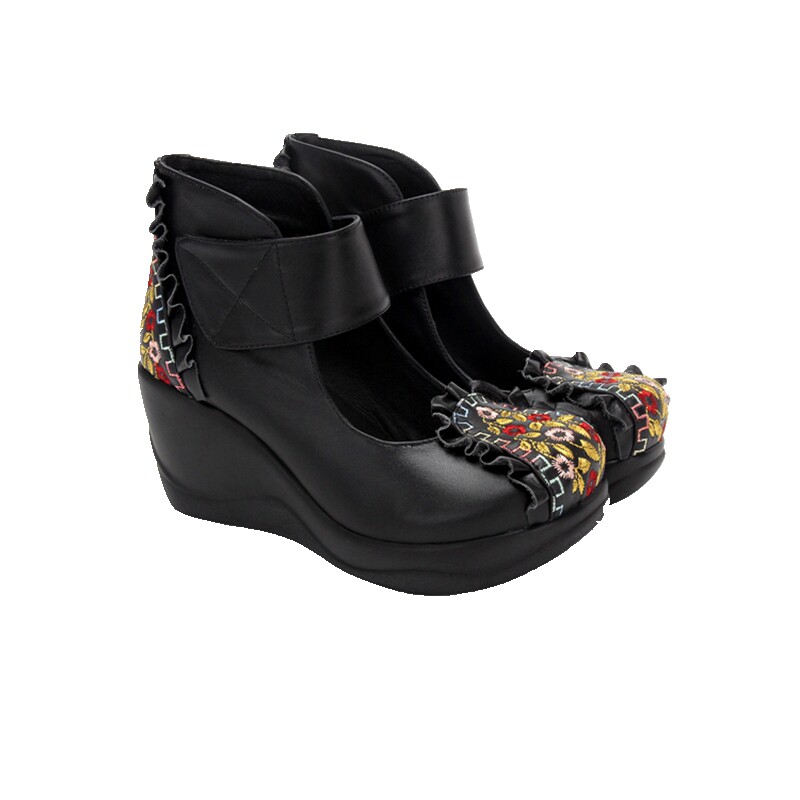 i民族风刺绣纯皮坡跟单鞋 女鞋 女松糕厚底女试胖脚妈妈 新款 春秋季