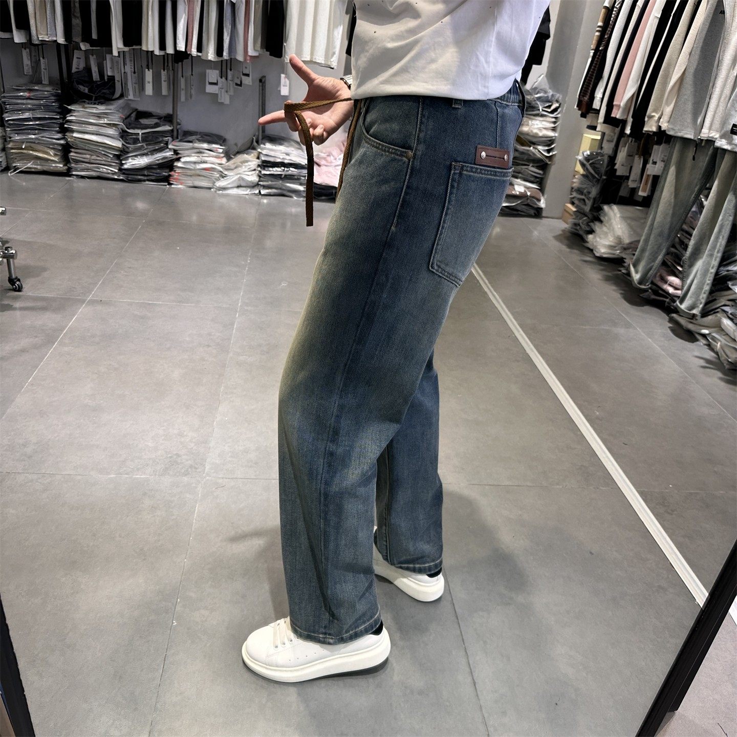 海王日记A字原牛个性 硬挺激光烧花提花拼接直筒显高牛仔裤