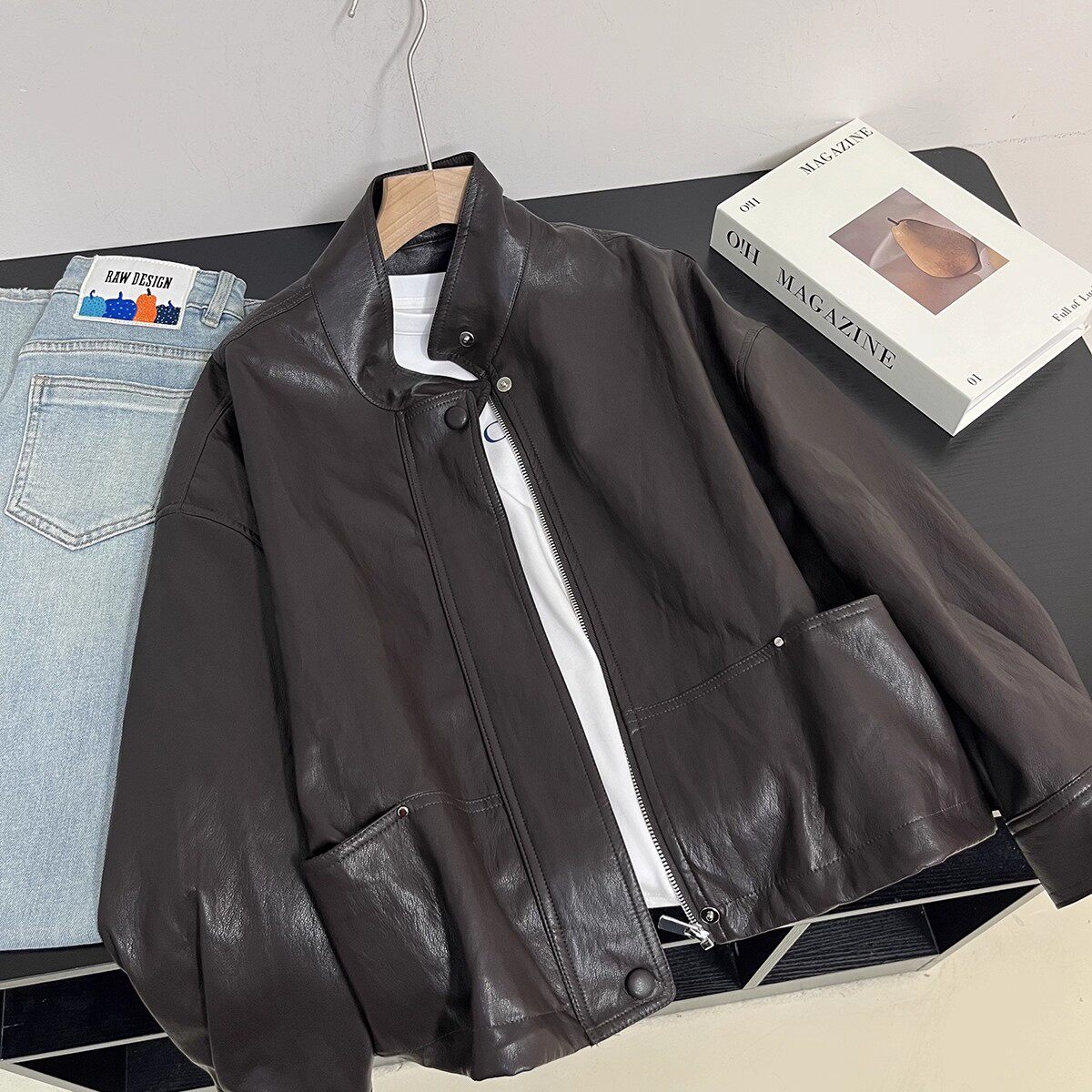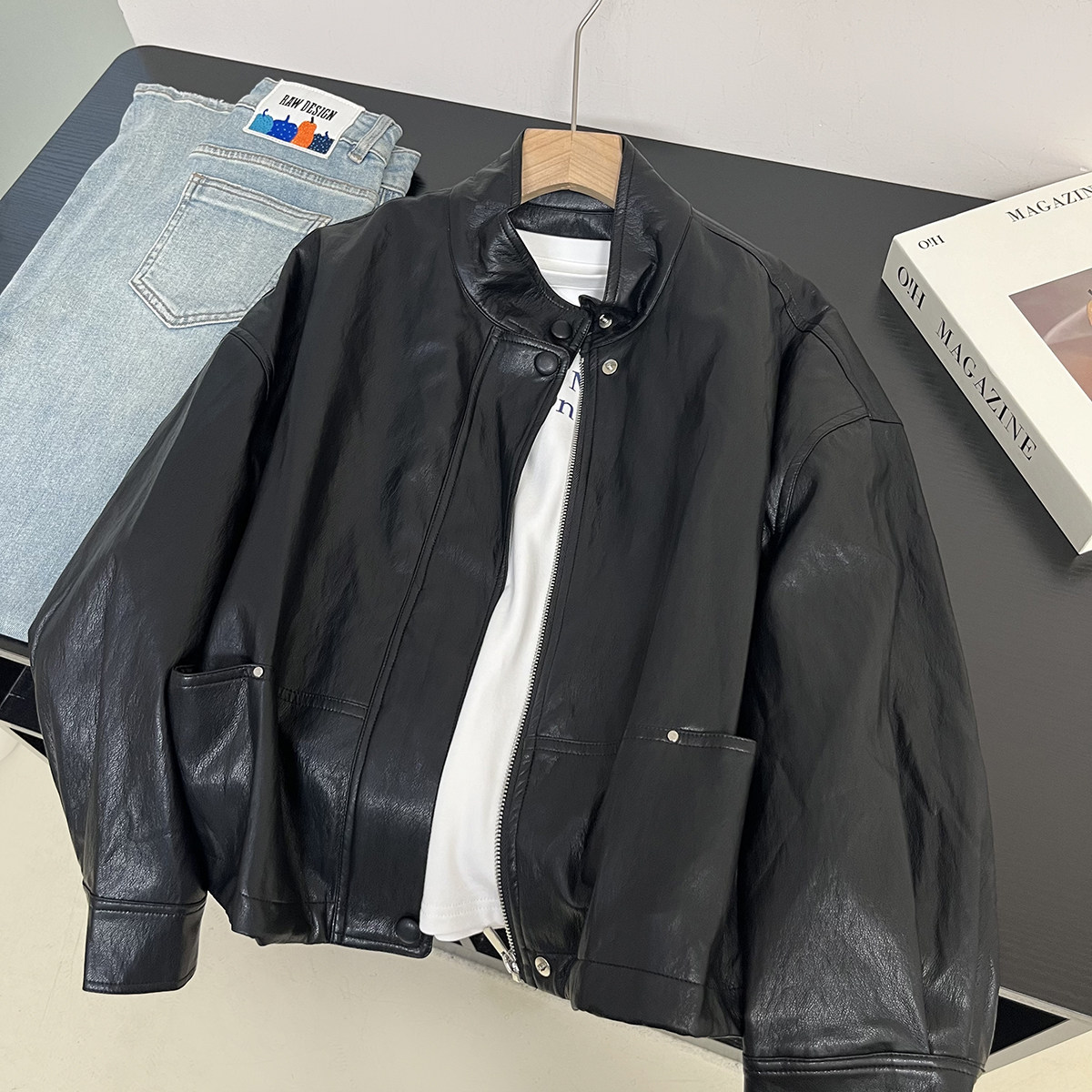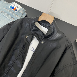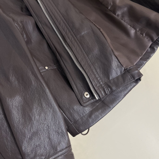 蛋白PU皮超柔软休闲夹克皮衣女秋季 外套上衣 复古宽松立领抽绳短款