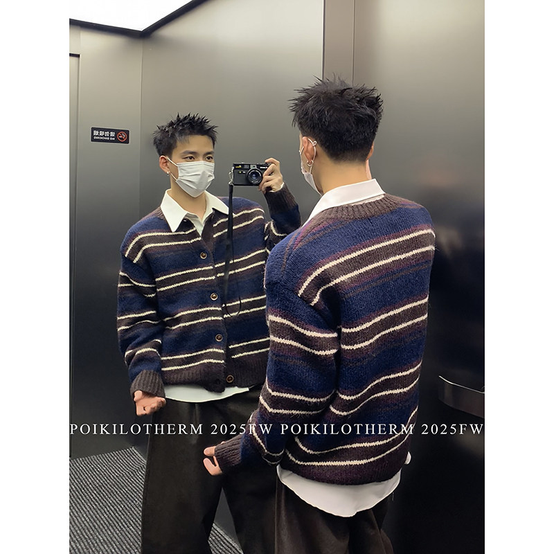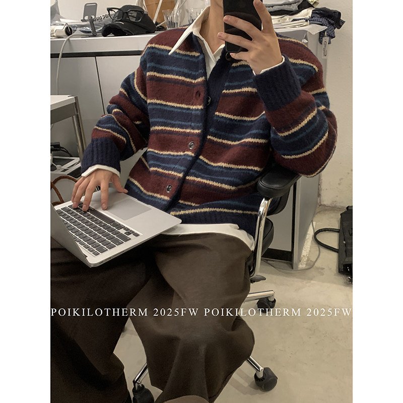 男冬季 复古学院风圆领撞色条纹针织开衫 羊毛毛衣外套潮 美式 PLTH