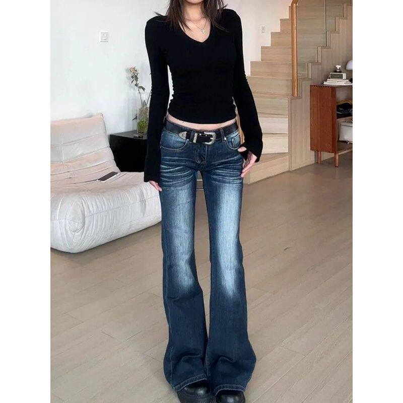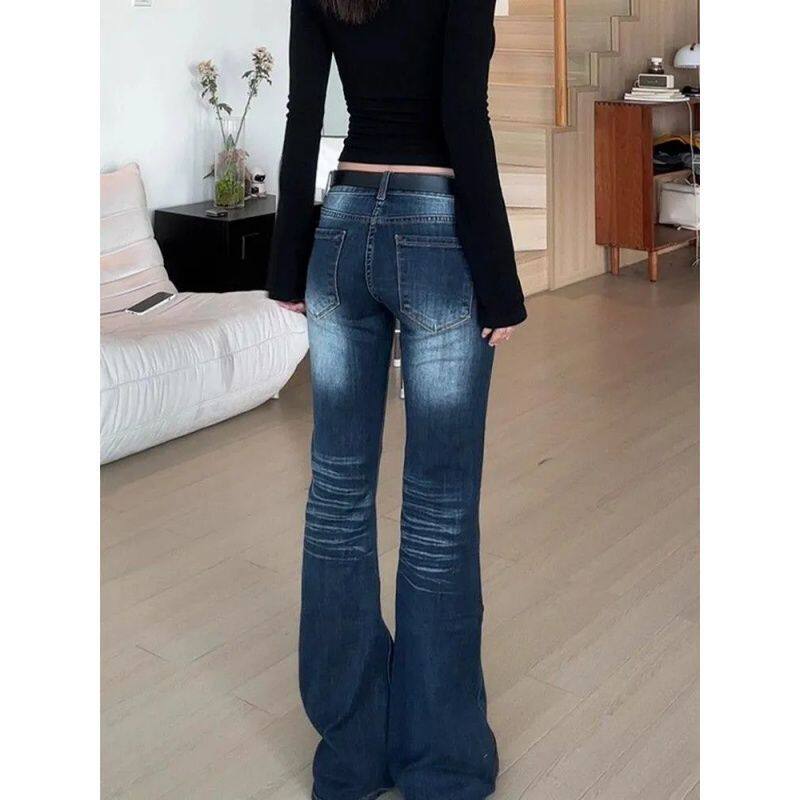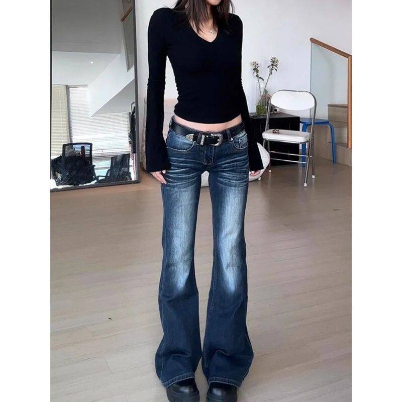 复古折痕直筒微喇牛仔裤 长裤 女2025秋季 低腰垂感马蹄修身 新款 美式