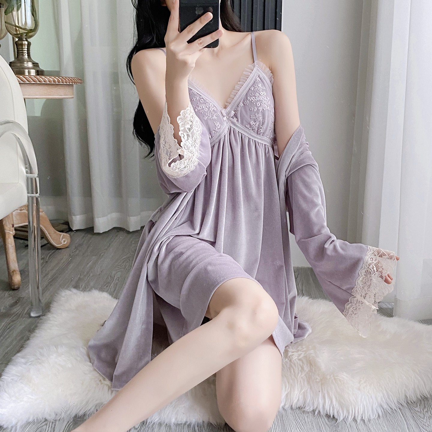 金丝绒冬季 秋季 蕾丝吊带睡裙带胸垫两件套 2025新款 性感睡衣女款