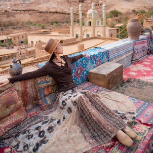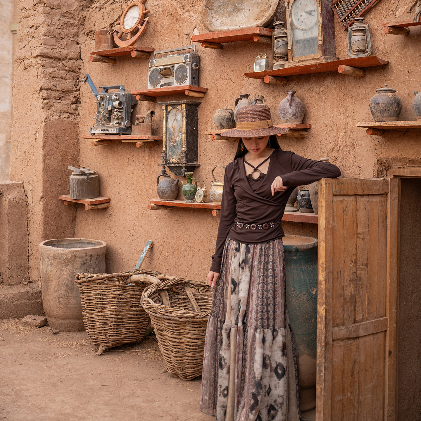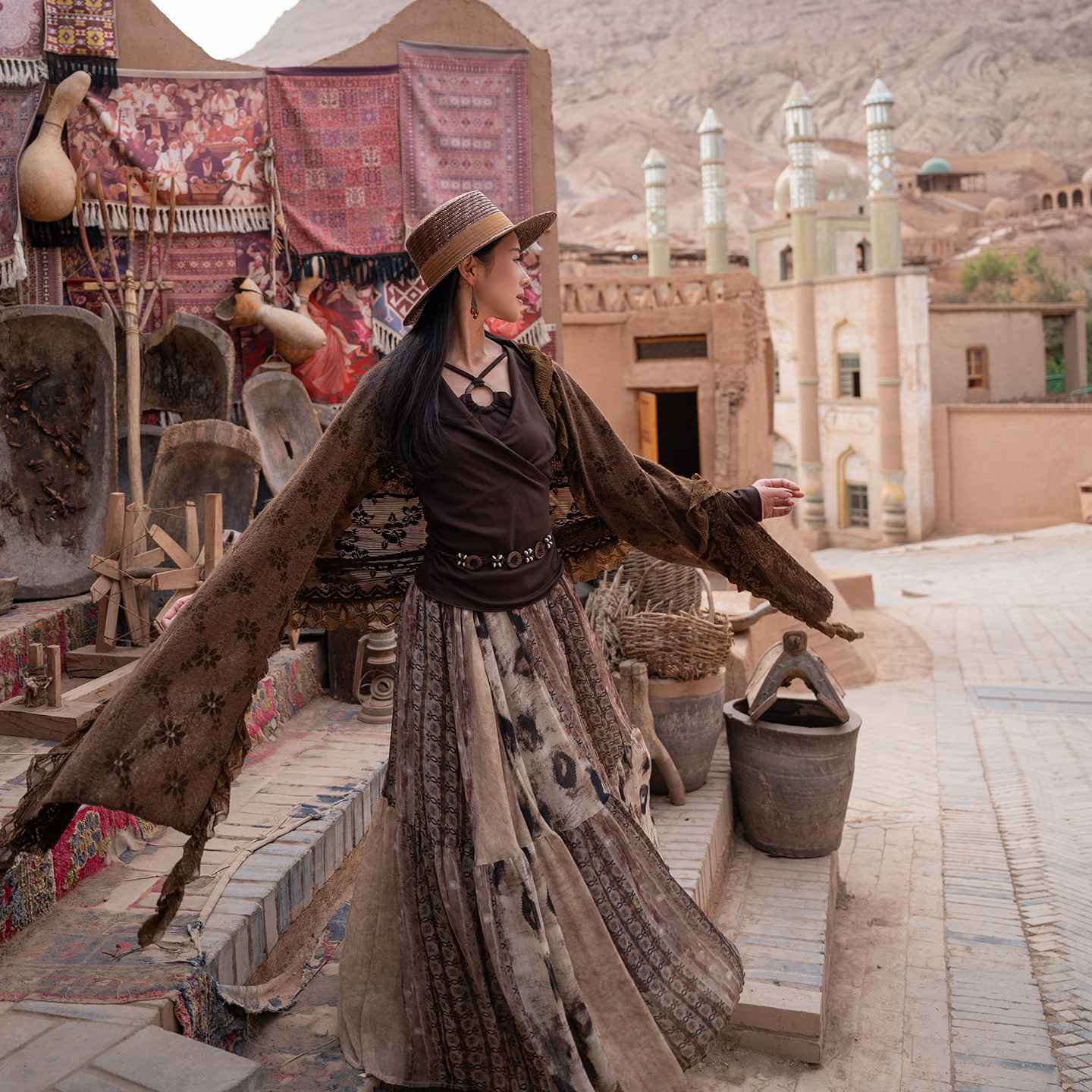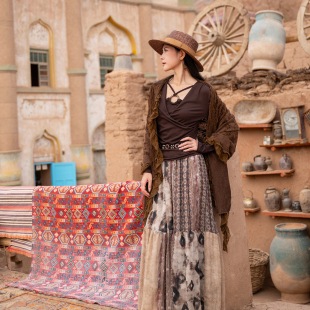 理想三旬复古波西米亚民族风咖啡色针织打底衫 大裙摆半身裙套装