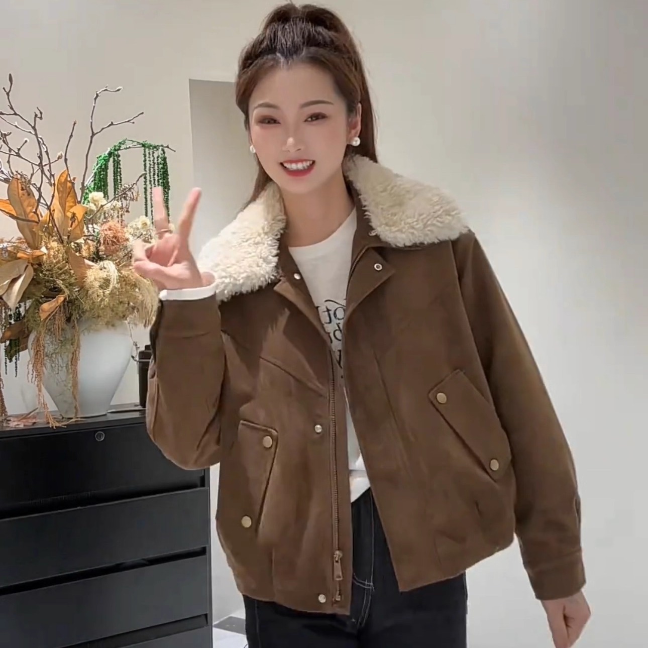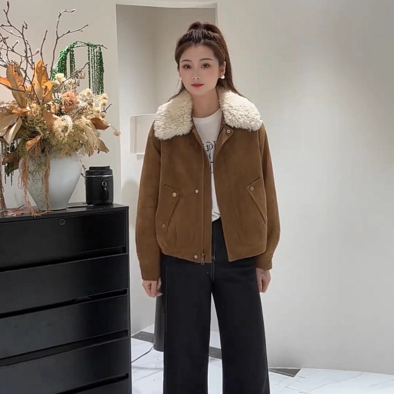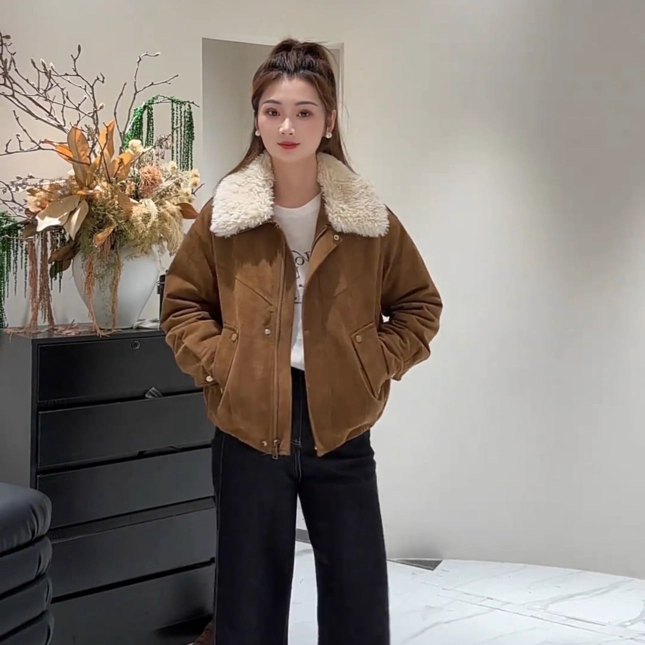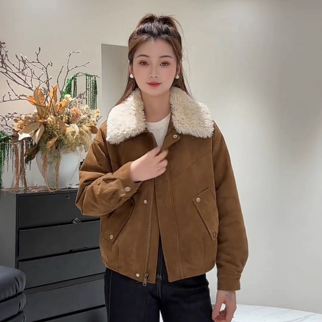 爆款 夹棉加厚可脱卸毛领麂皮绒棉服外套女秋冬2025夹克保暖派克服
