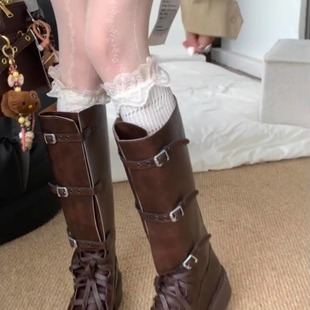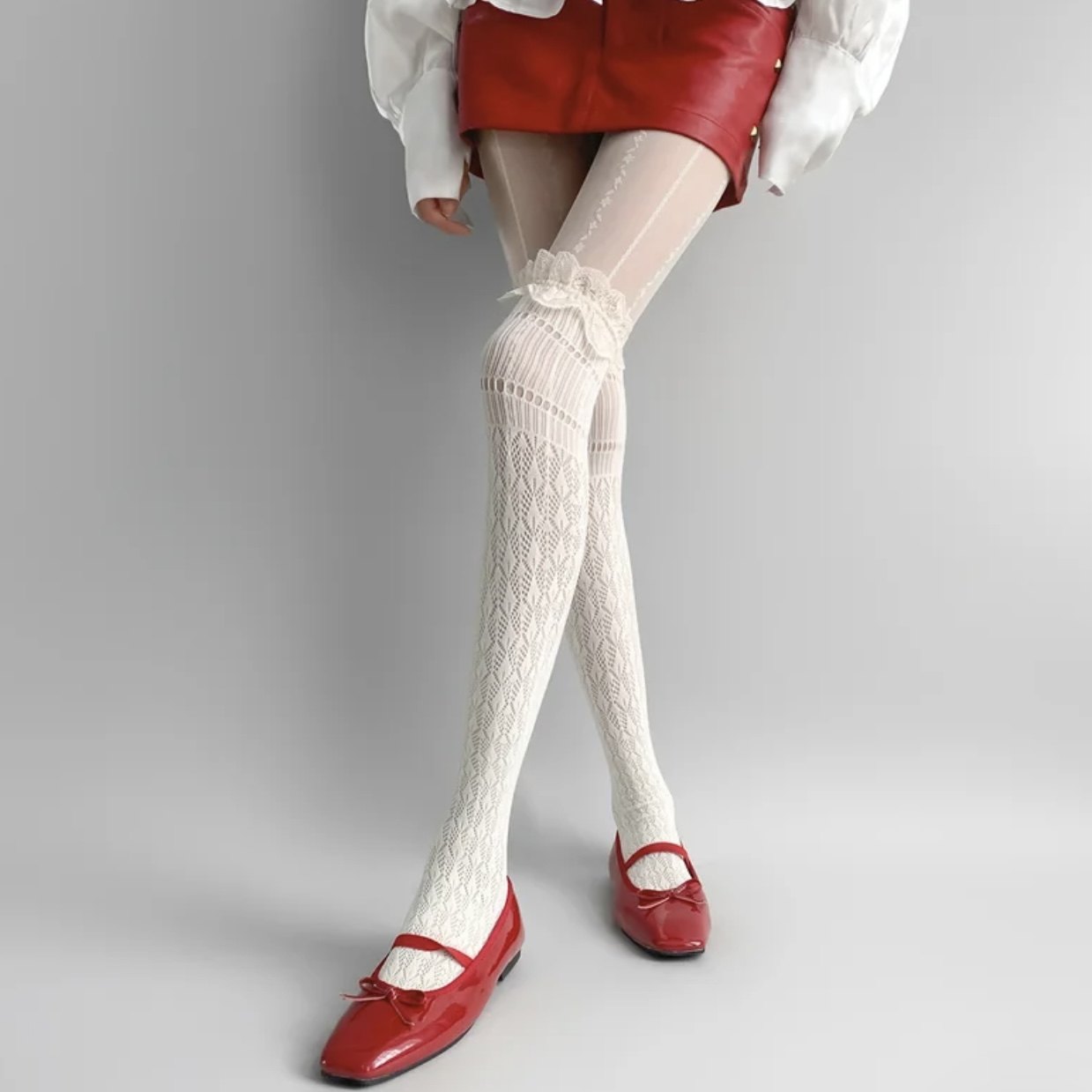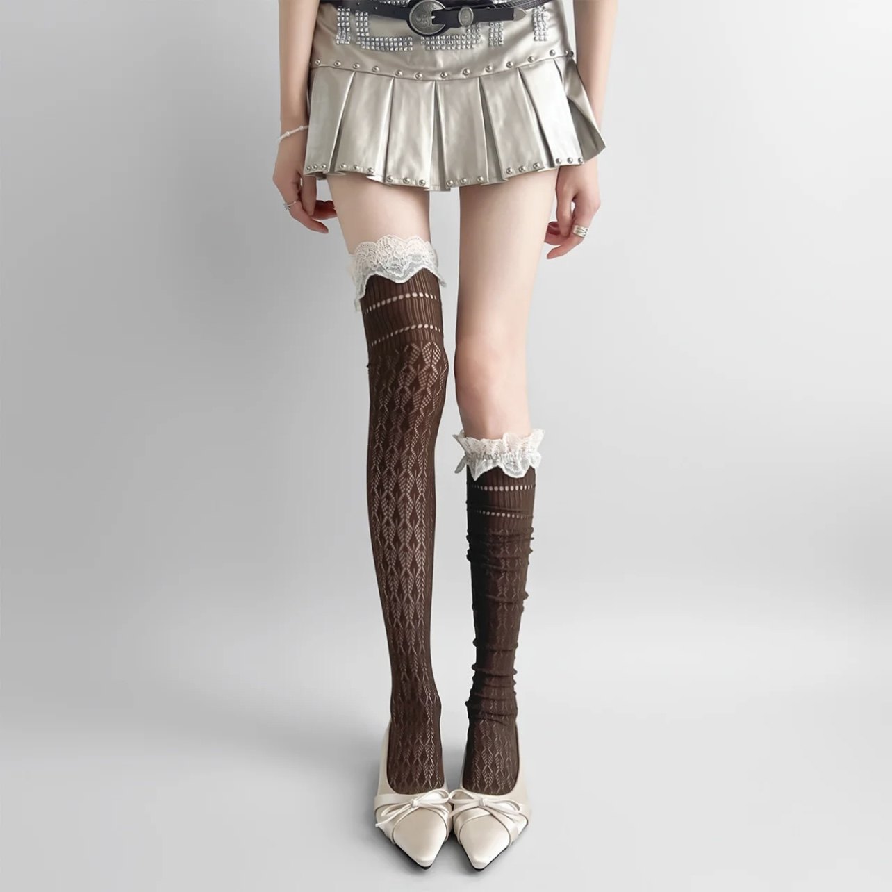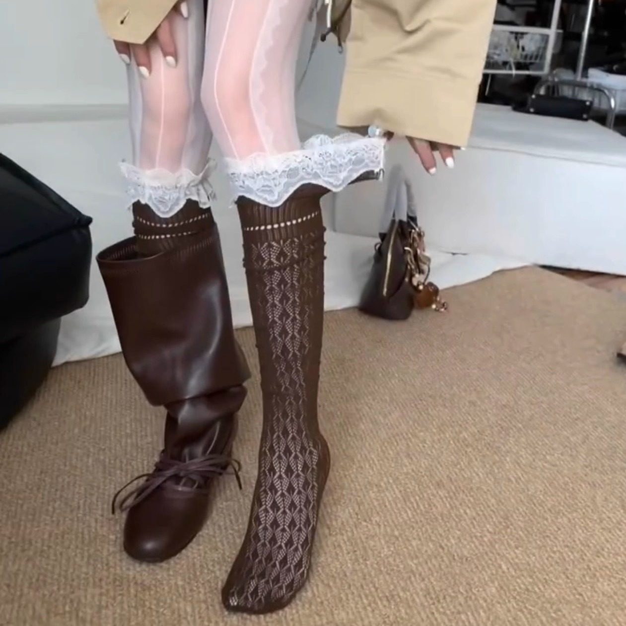 Wuuuus 靴子袜子女黑色过膝袜春秋薄蕾丝花边复古镂空性感长筒袜