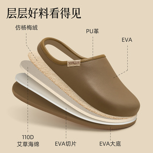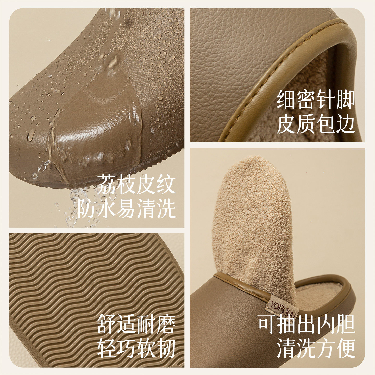 室内防滑居家用保暖加绒棉拖鞋 秋冬季 女冬天 防水皮纹拖鞋 远港男士