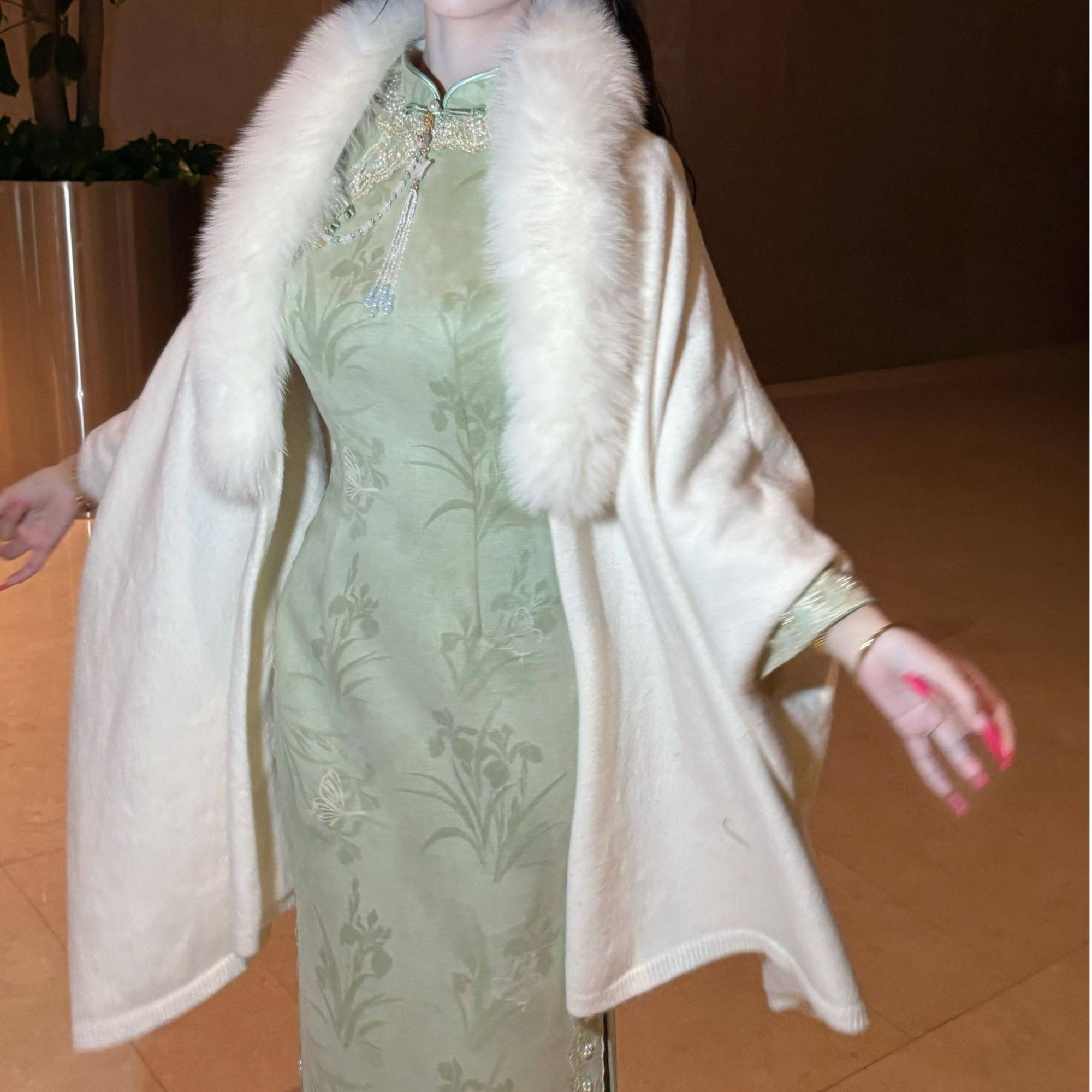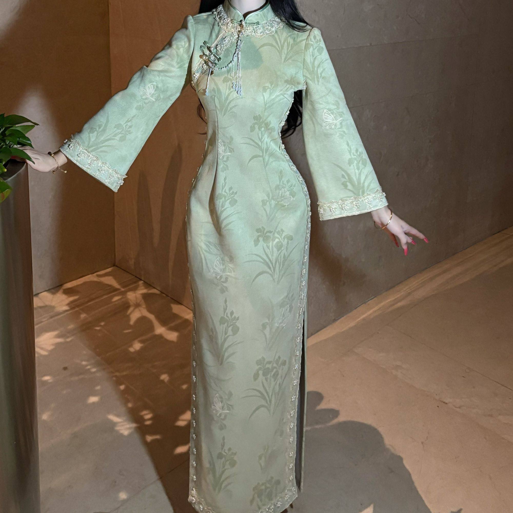 画报夫人原创自制秋冬麂皮珠链蕾丝新式 豆绿太太 旗袍
