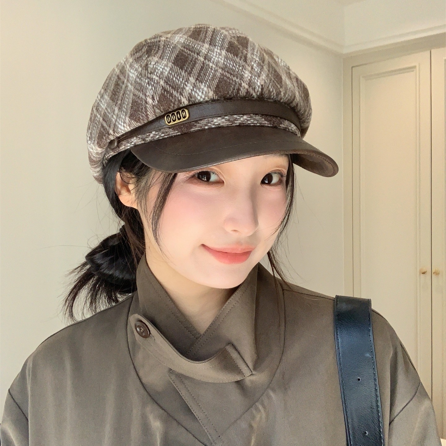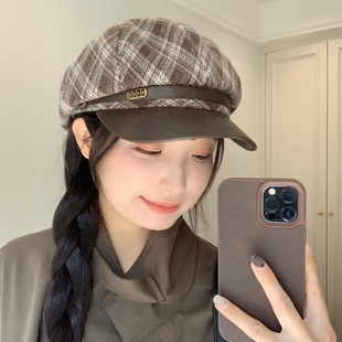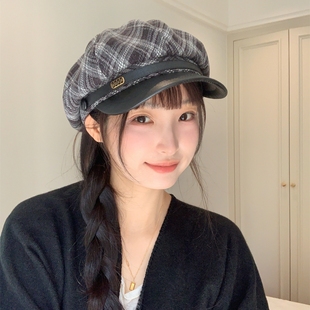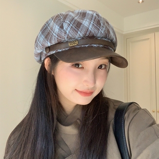 百搭八角帽 秋冬毛呢格纹复古贝雷帽女ins气质时尚 巨好看蓝棕 新款