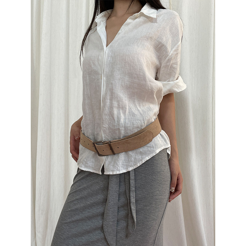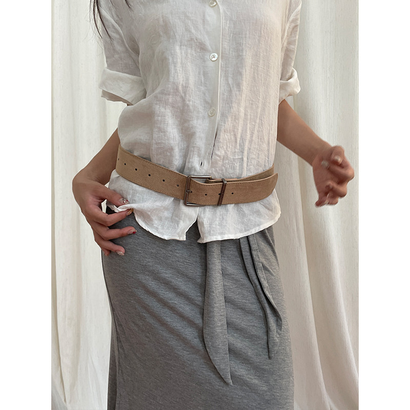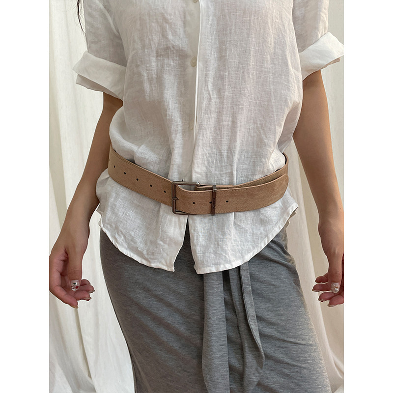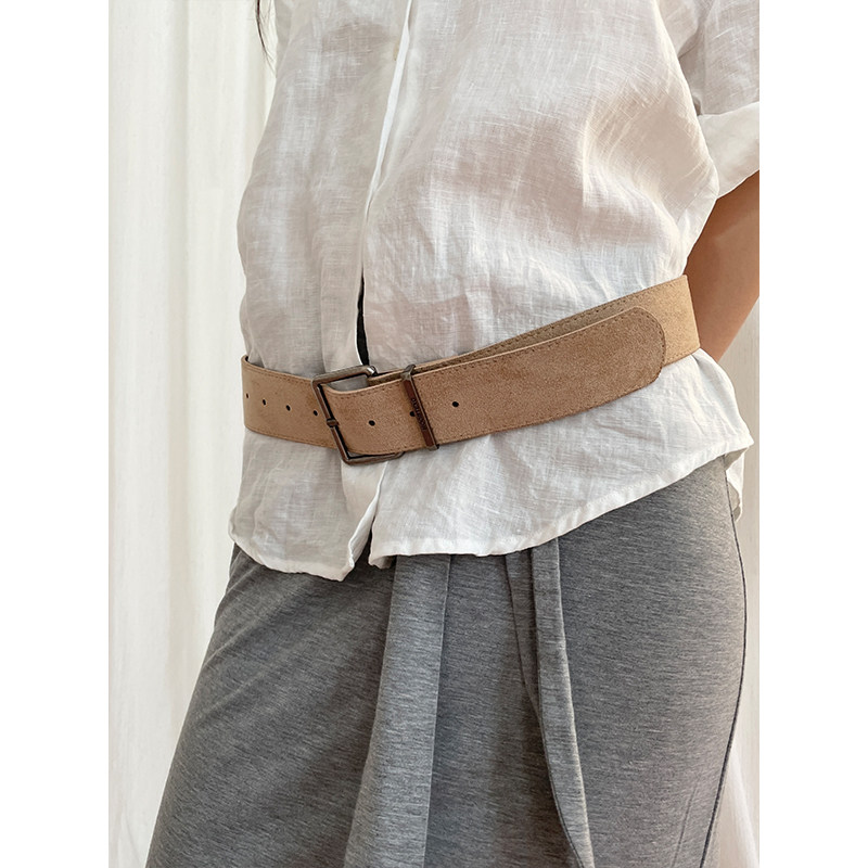 简约高级感韩系卡其色绒面银扣腰带小众设计感百搭复古宽边皮带
