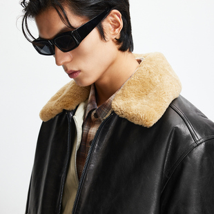 tq区绫致杰克琼斯男皮衣冬简约贴袋宽松休闲翻领羊皮革外套