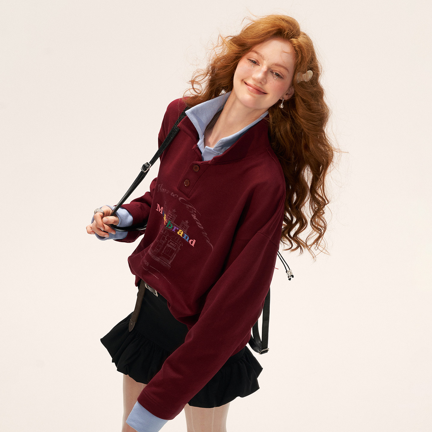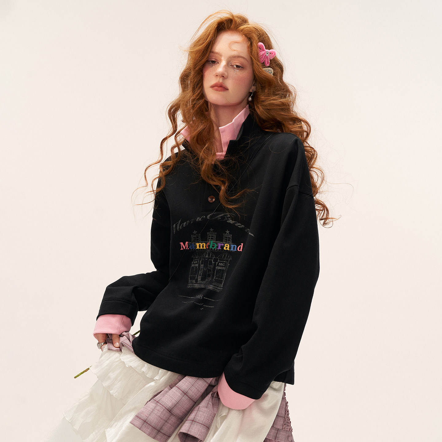 长袖 宽松休闲时尚 外套 美式 MAMC假两件纽扣翻领polo卫衣女2025新款