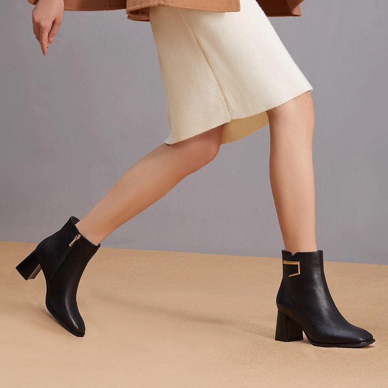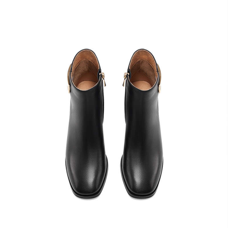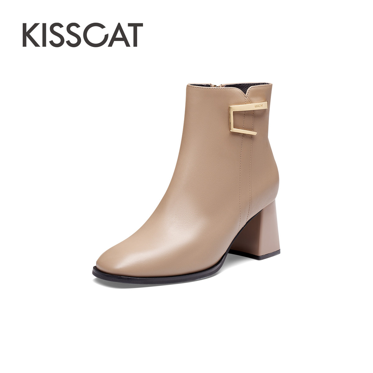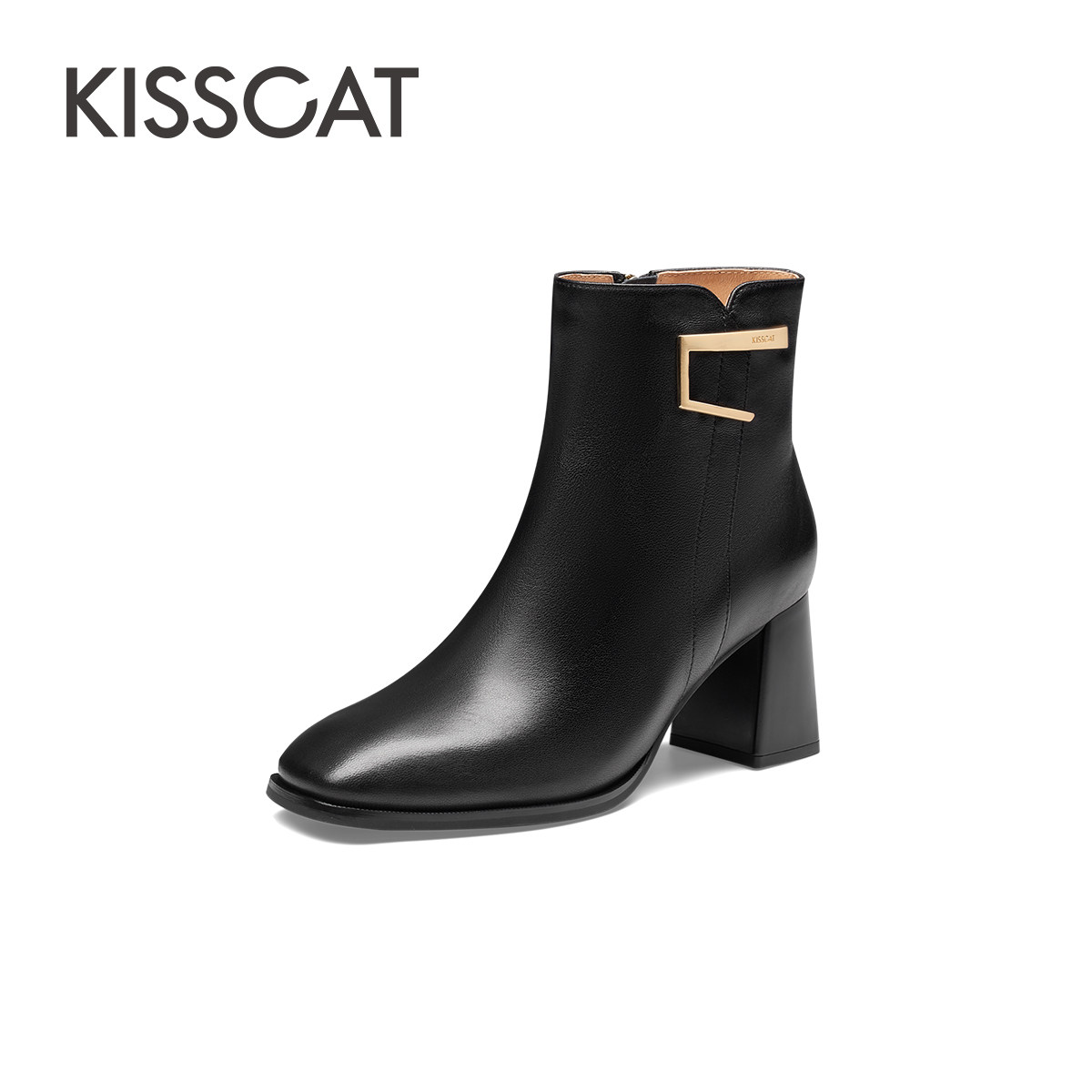 女KA43710 接吻猫秋冬羊皮方头短筒侧拉链粗高跟时装 CAT KISS