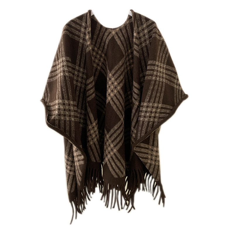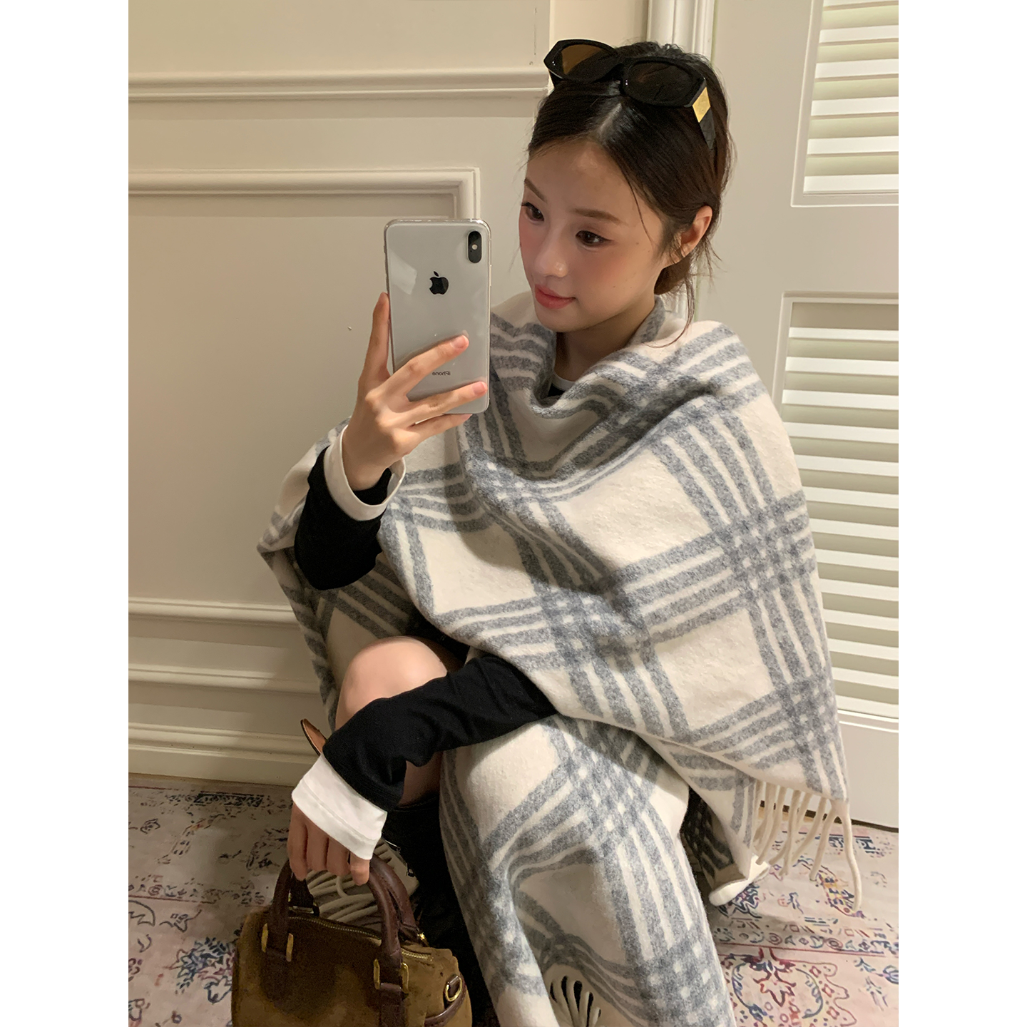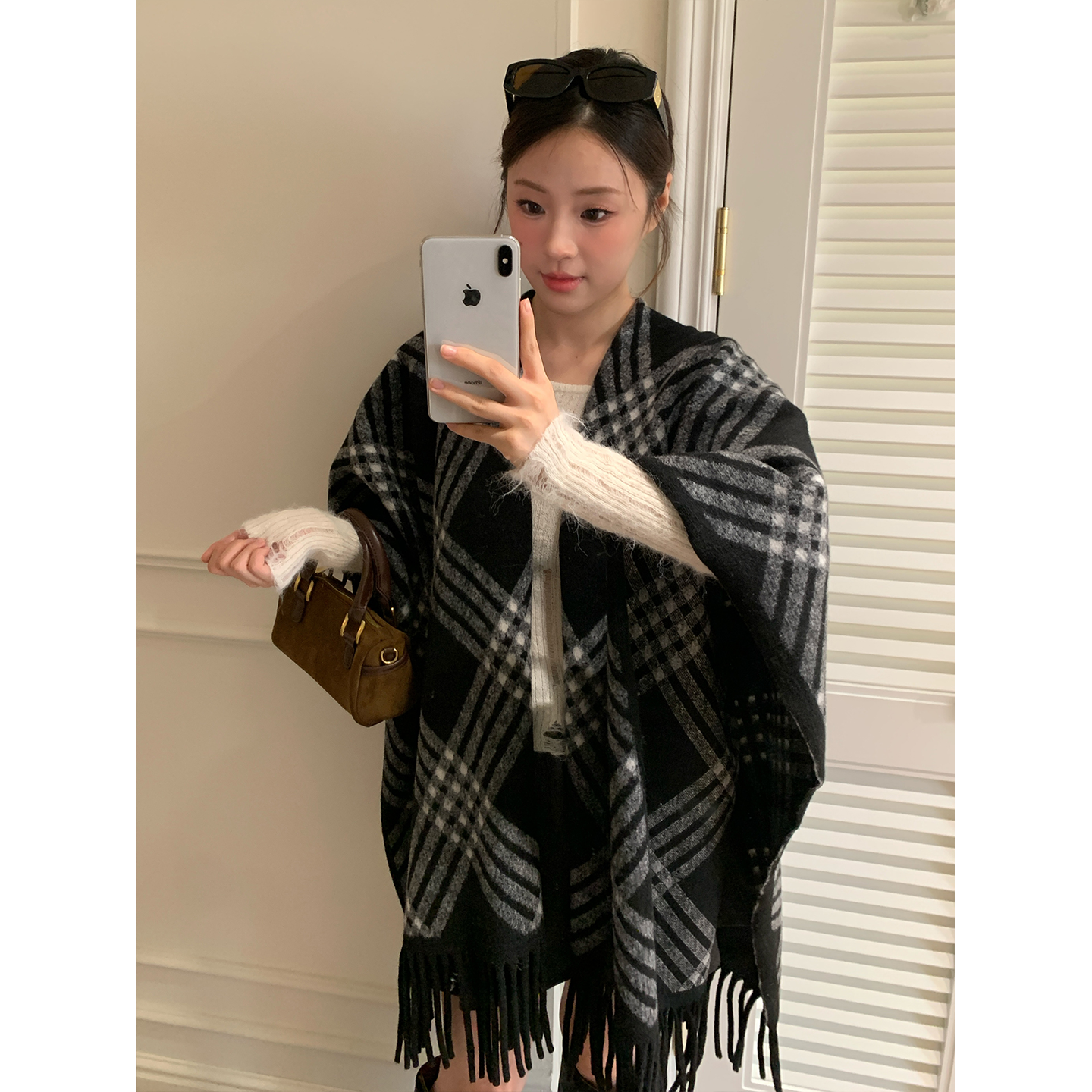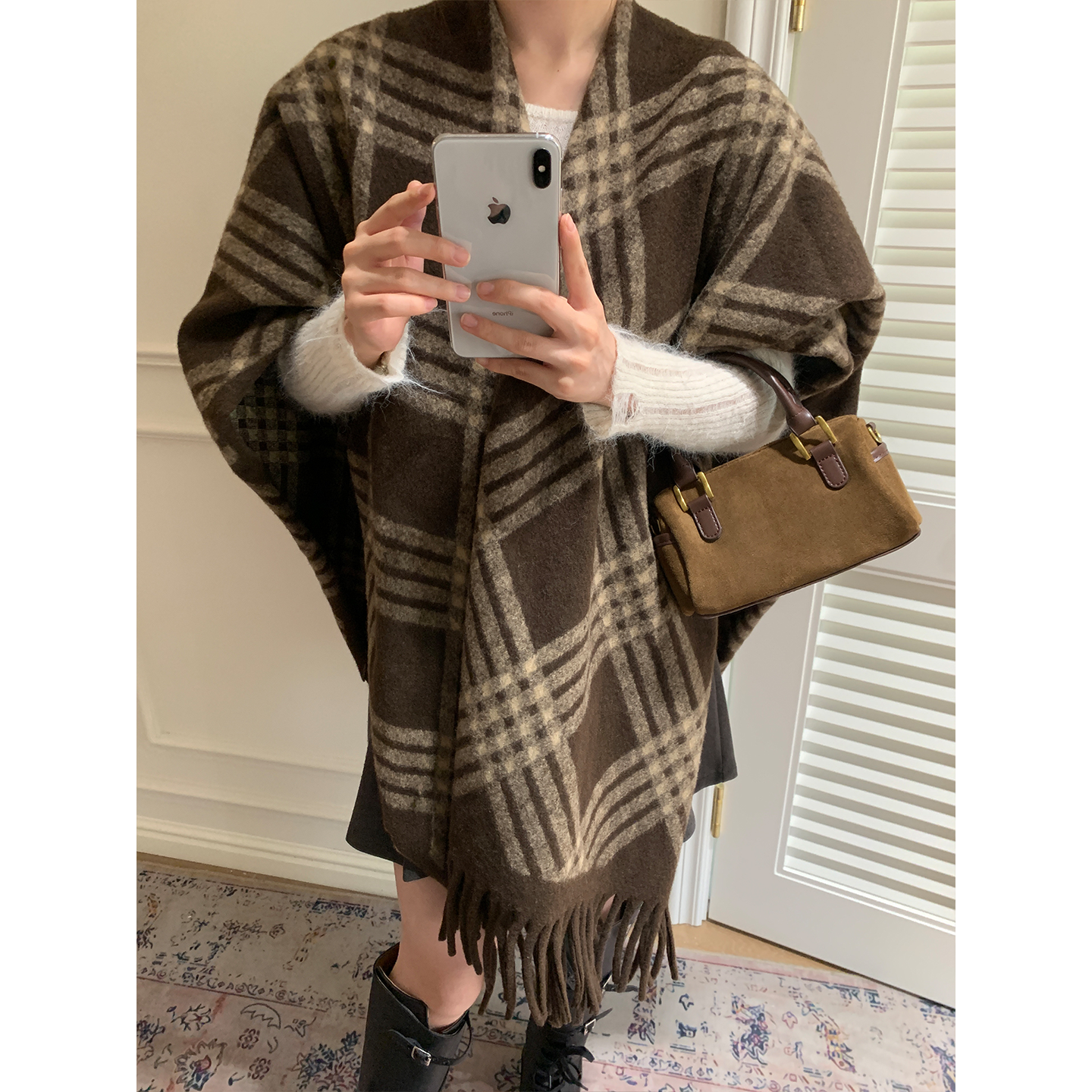 韩系慵懒感复古格纹披肩女外搭秋冬季 高级感保暖围巾斗篷披风 时尚