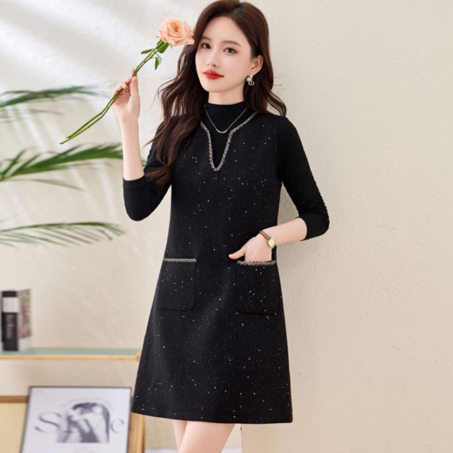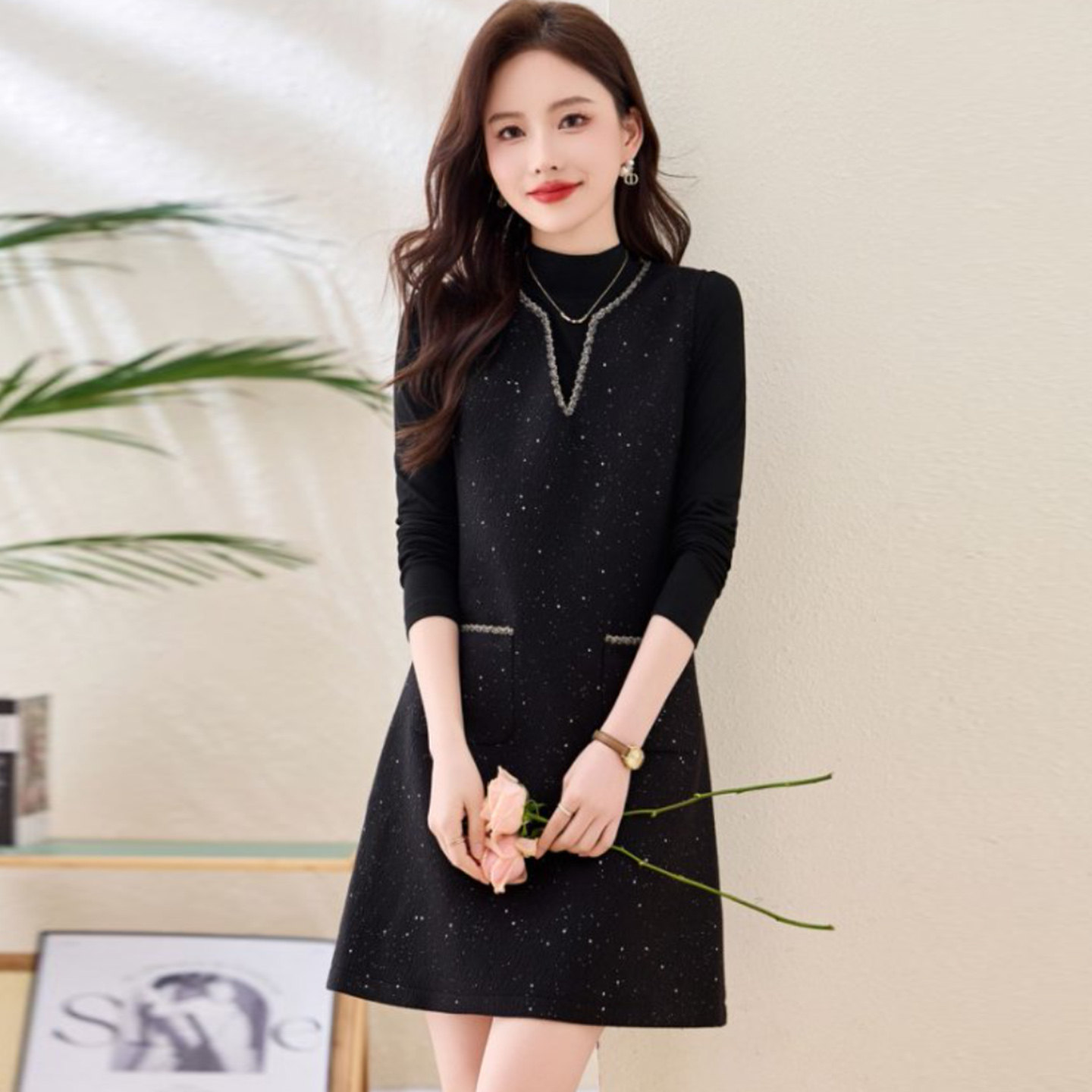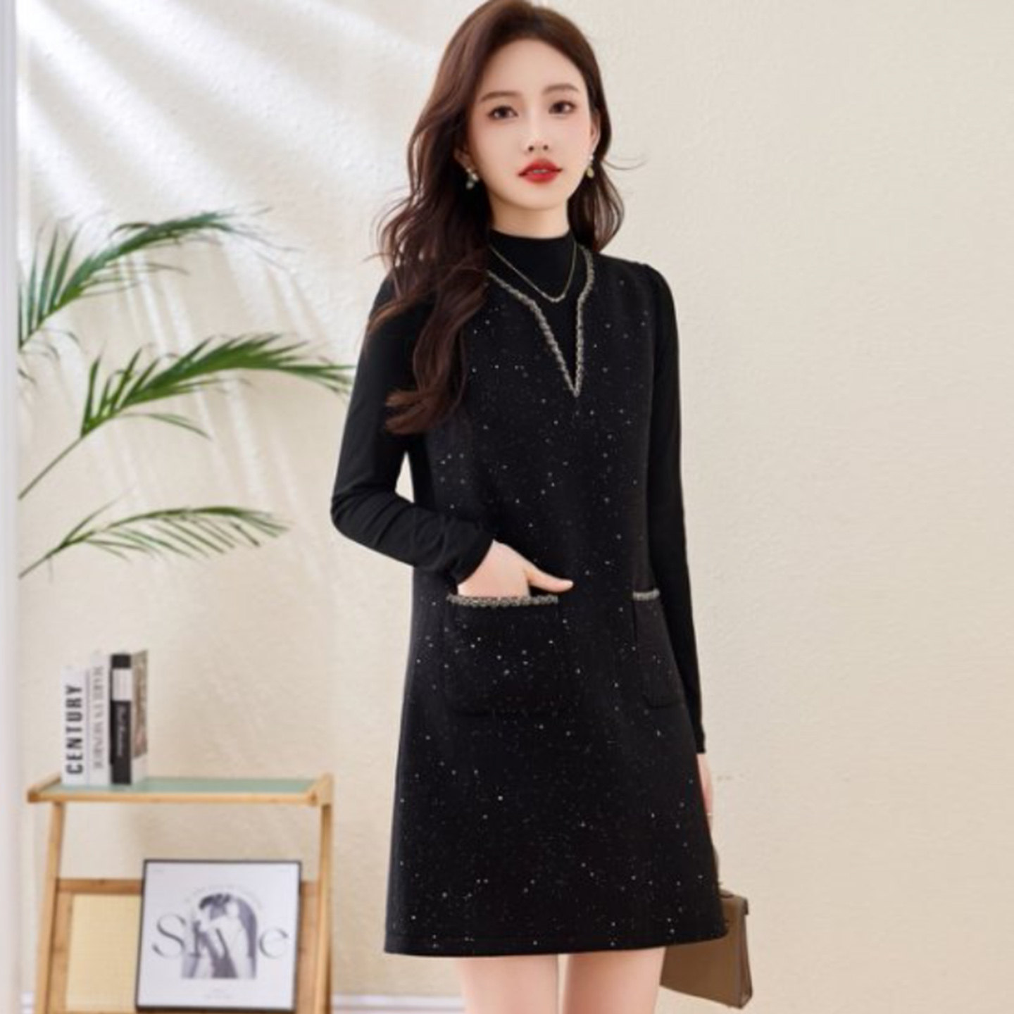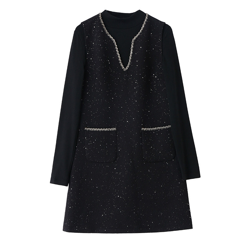 小香风黑色亮片中长款 背心连衣裙女春秋高级感两件套裙子 V领无袖