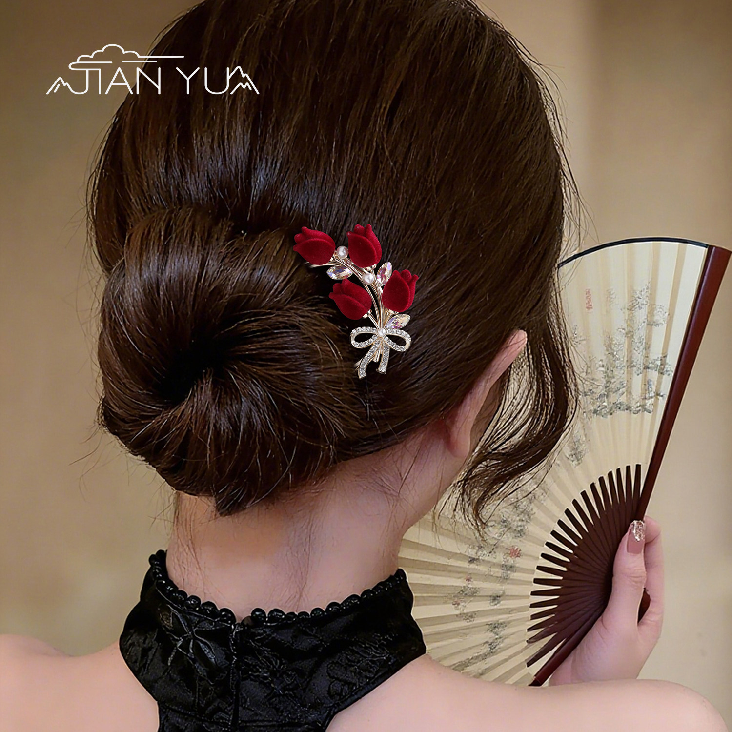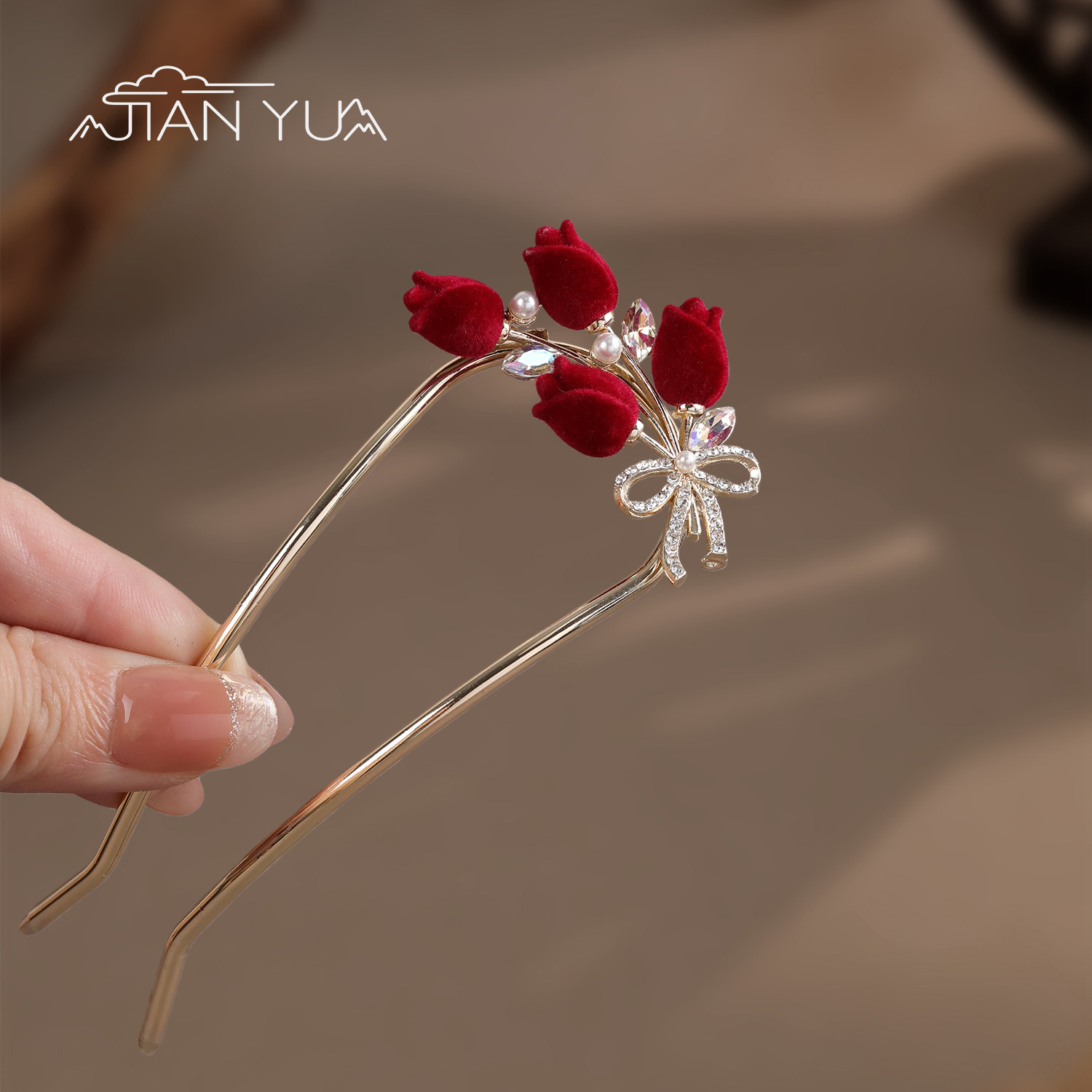 绛玫金簪 红色郁金香U型发簪花朵流苏发钗旗袍敬酒服头饰女 新中式