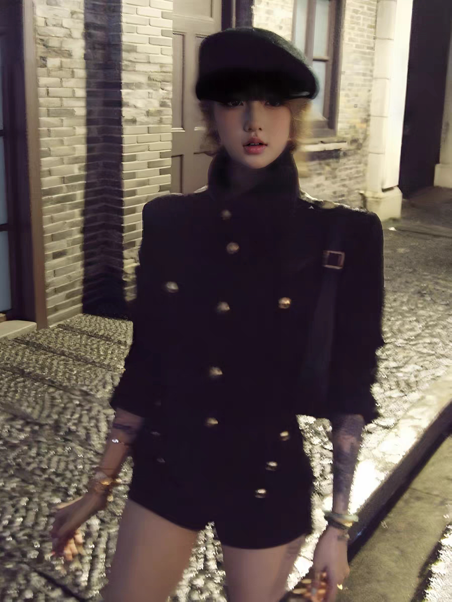 御姐穿搭一整套性感辣妹复古黑色夹克外套高腰短裤 2025冬 两件套装