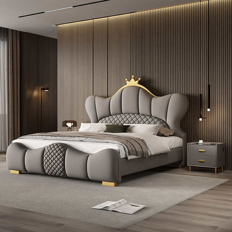 意式 真皮床主卧2米x2米2大床现代简约1.8米软包皮艺实木储物婚床