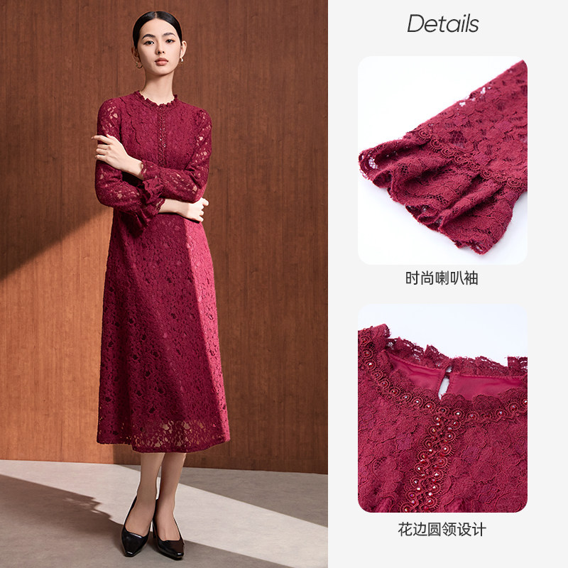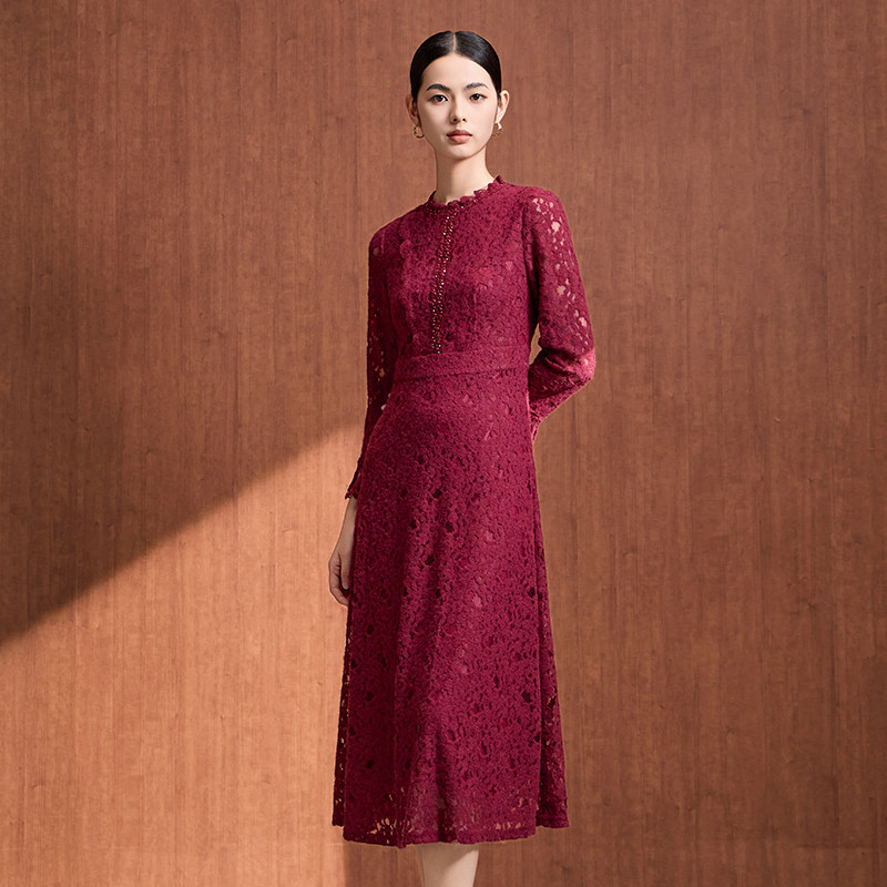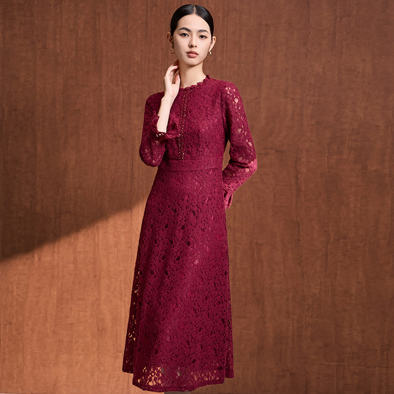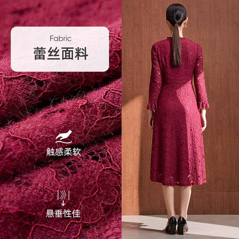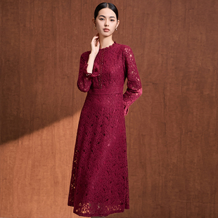 马天奴女装 酒红色蕾丝连衣裙高级喜婆婆礼裙超好看长裙子 春秋新款