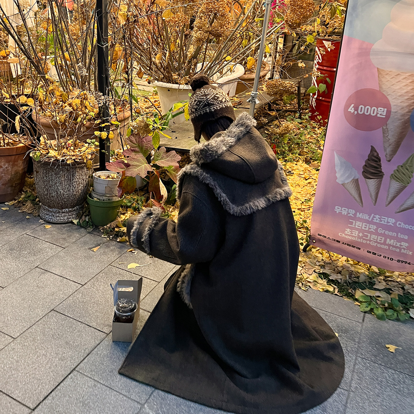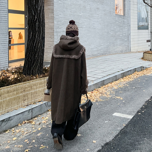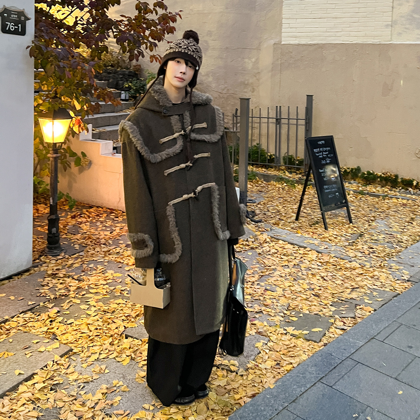 呢大衣外套男女同款 高林凡 复古格纹拼接毛毛设计感中长款