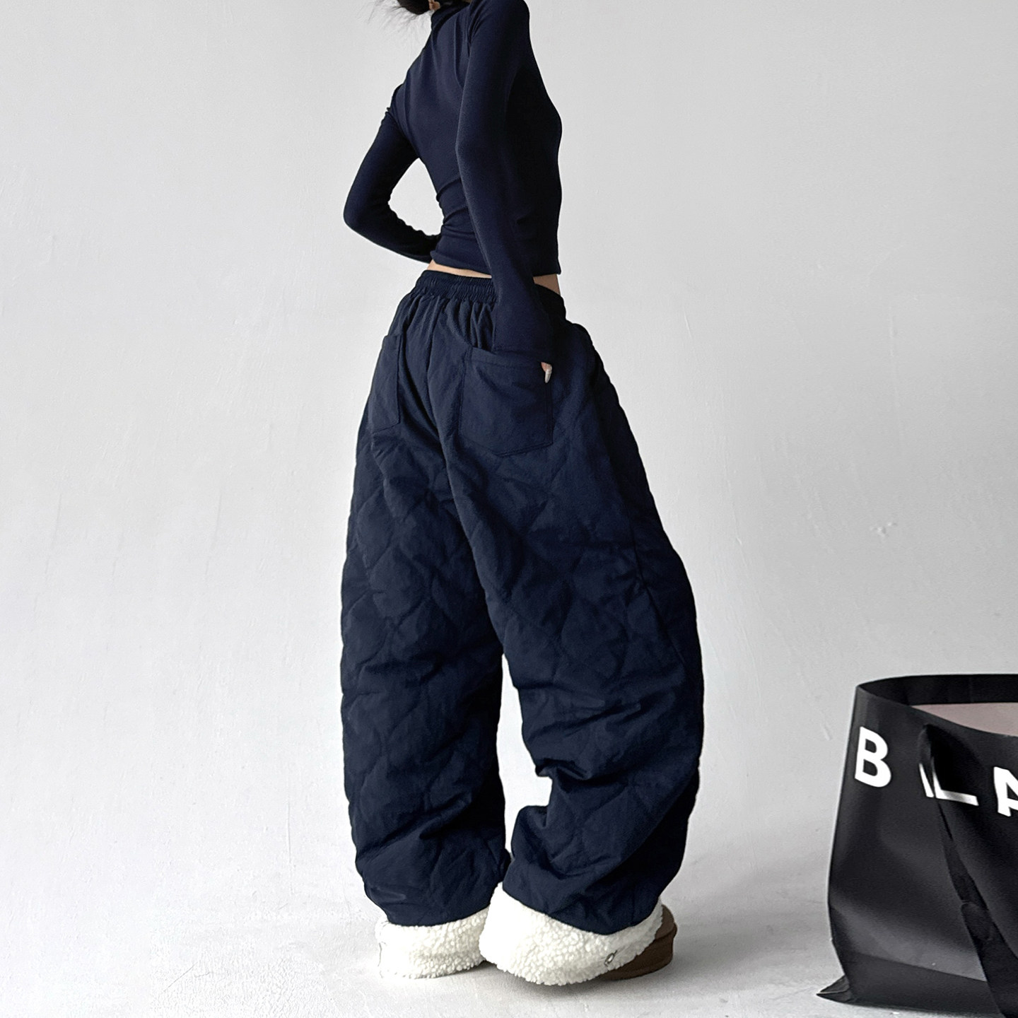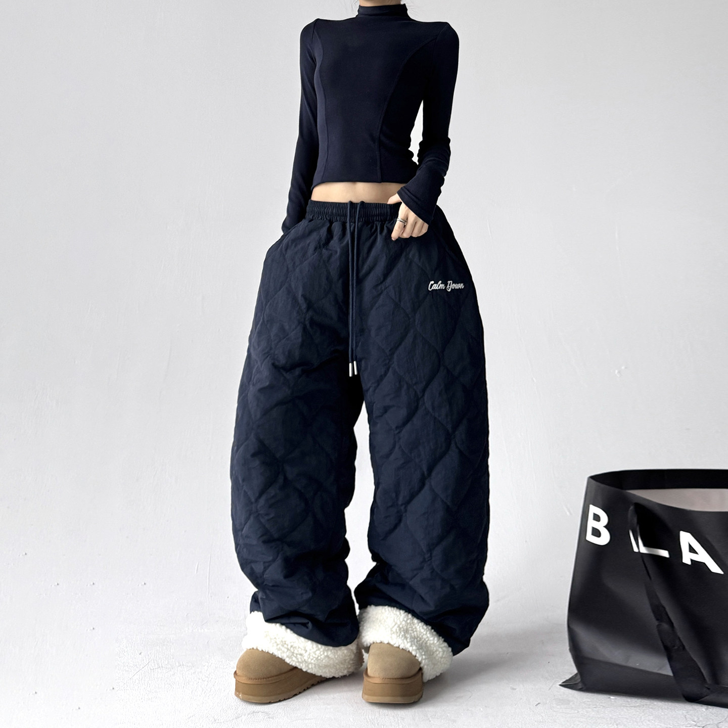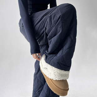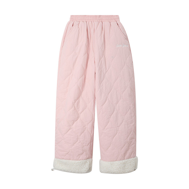藏蓝色 显瘦直筒裤 宽松菱格纹棉裤 女加厚保暖休闲裤
