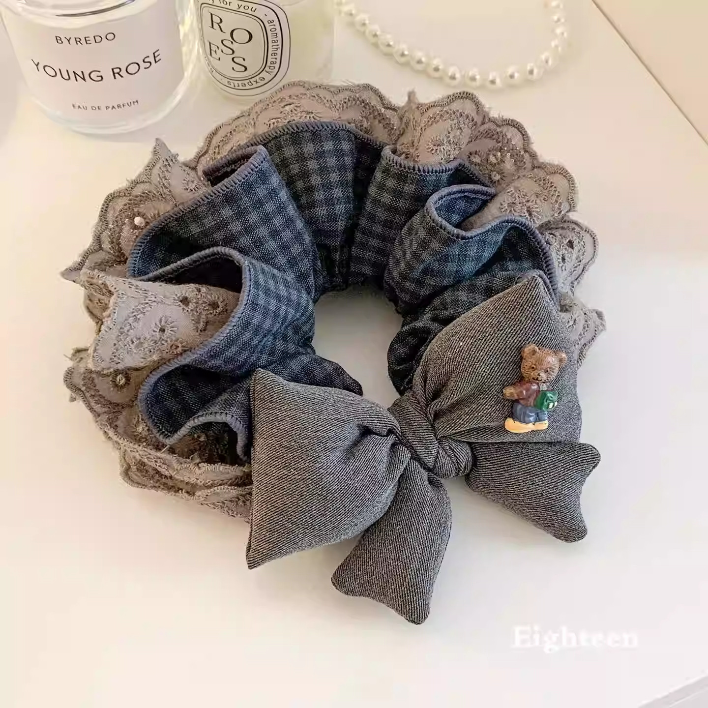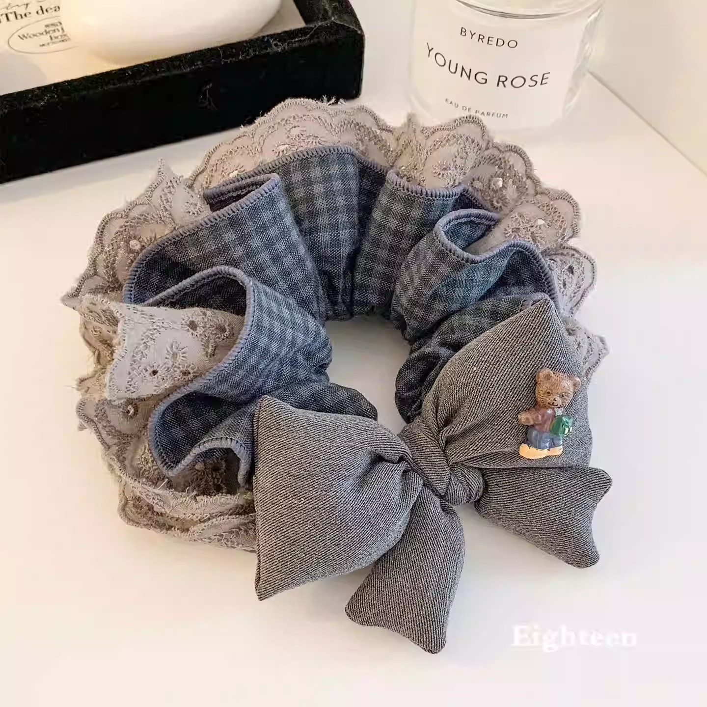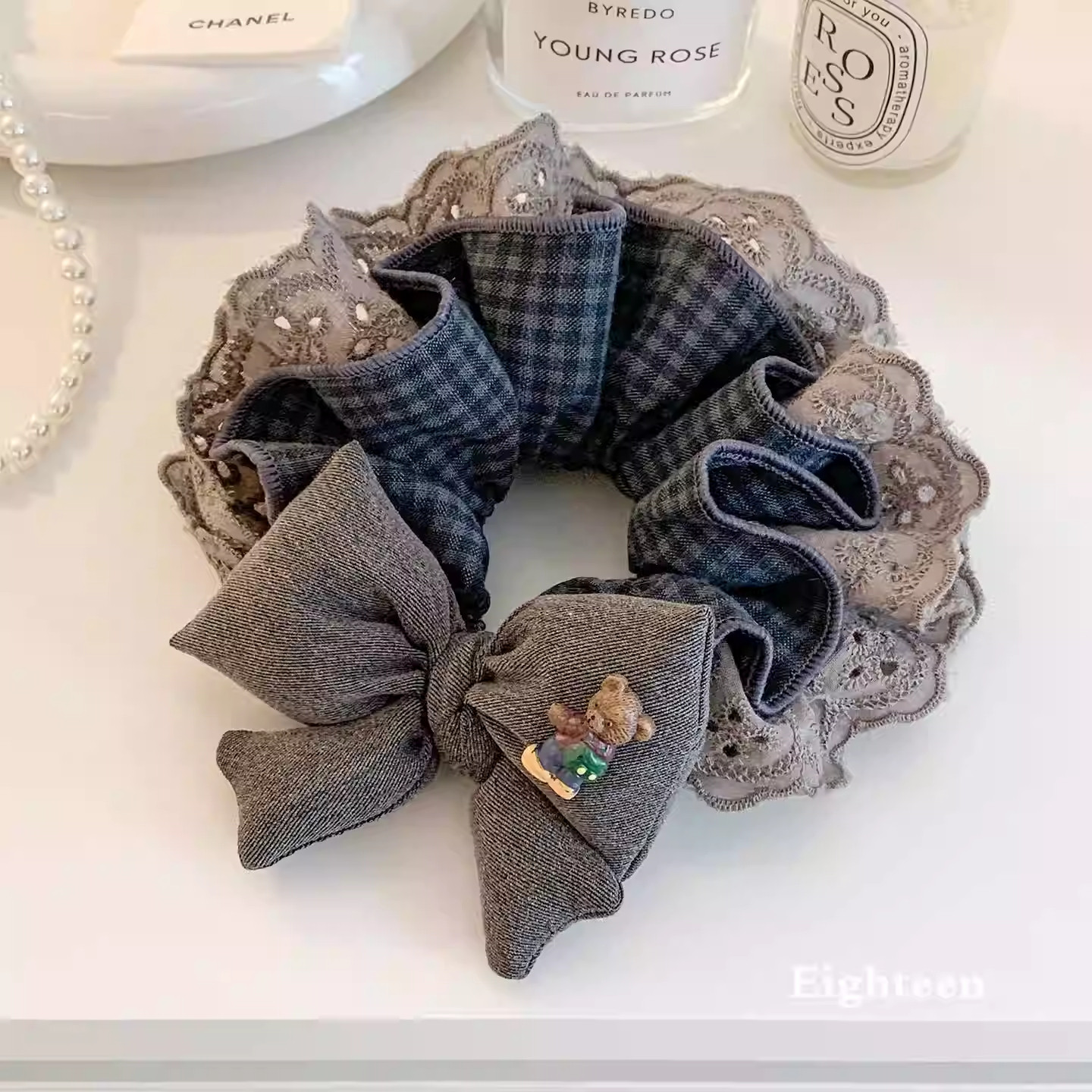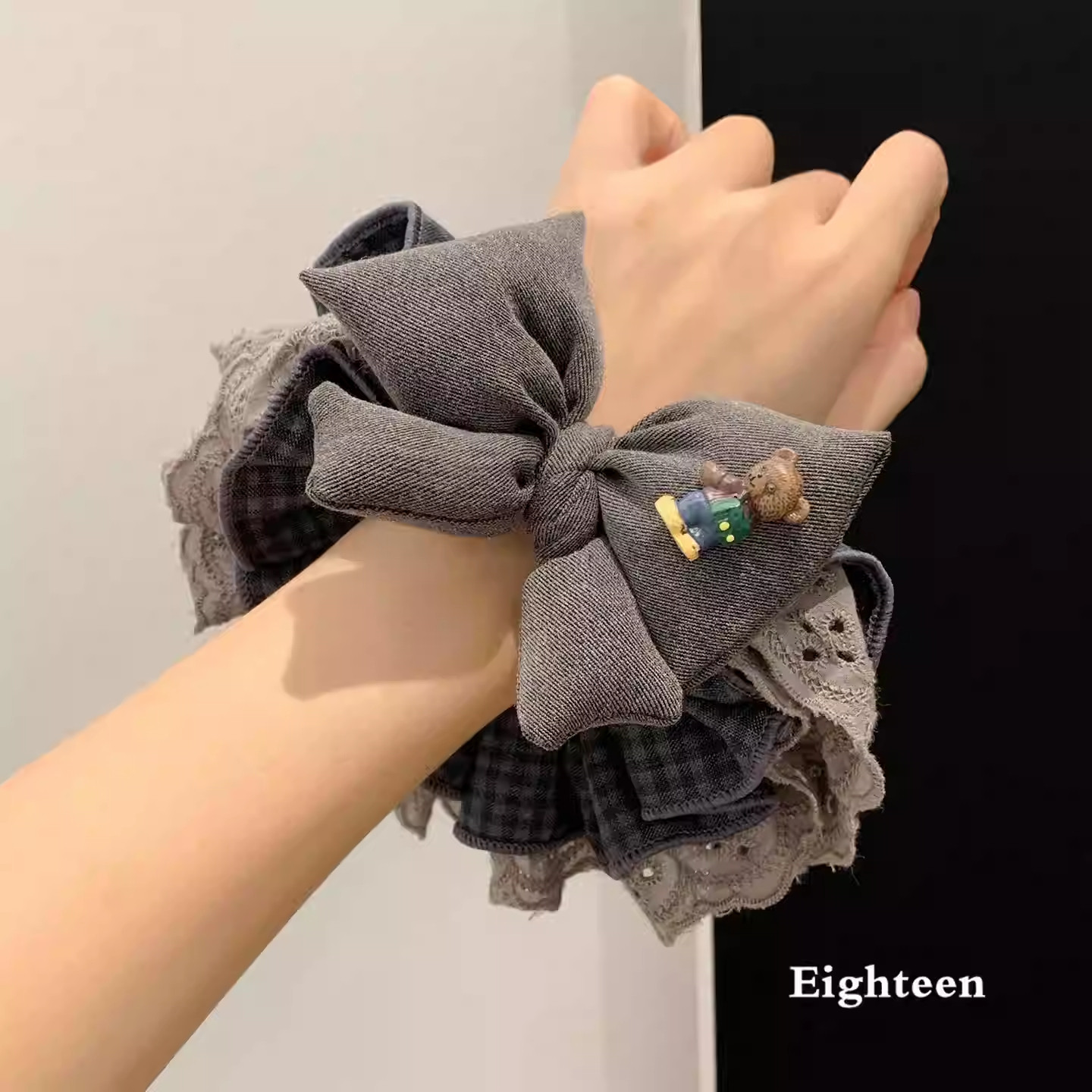 韩系复古灰色格子蝴蝶结蕾丝大肠发圈女超大丸子头低马尾头绳头饰