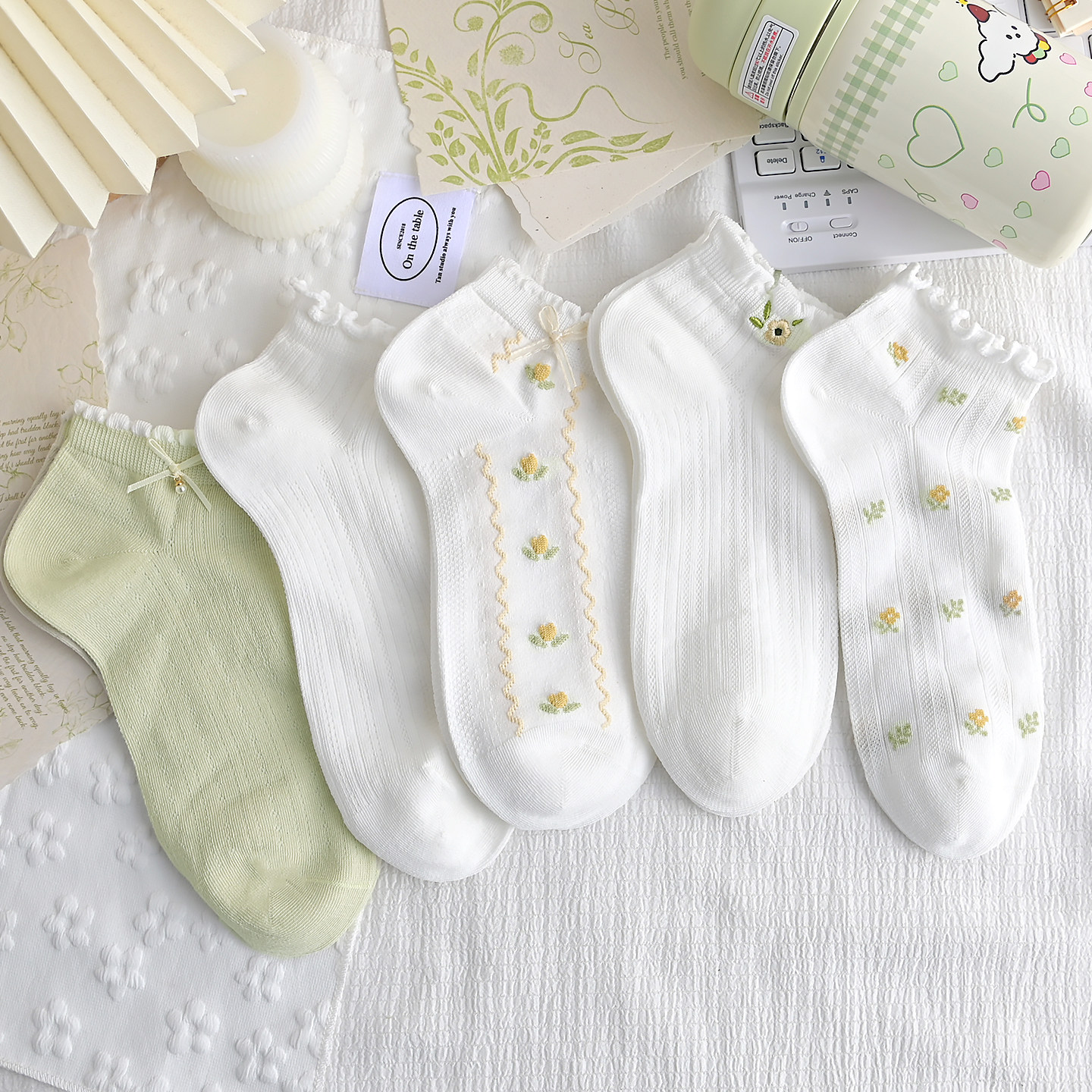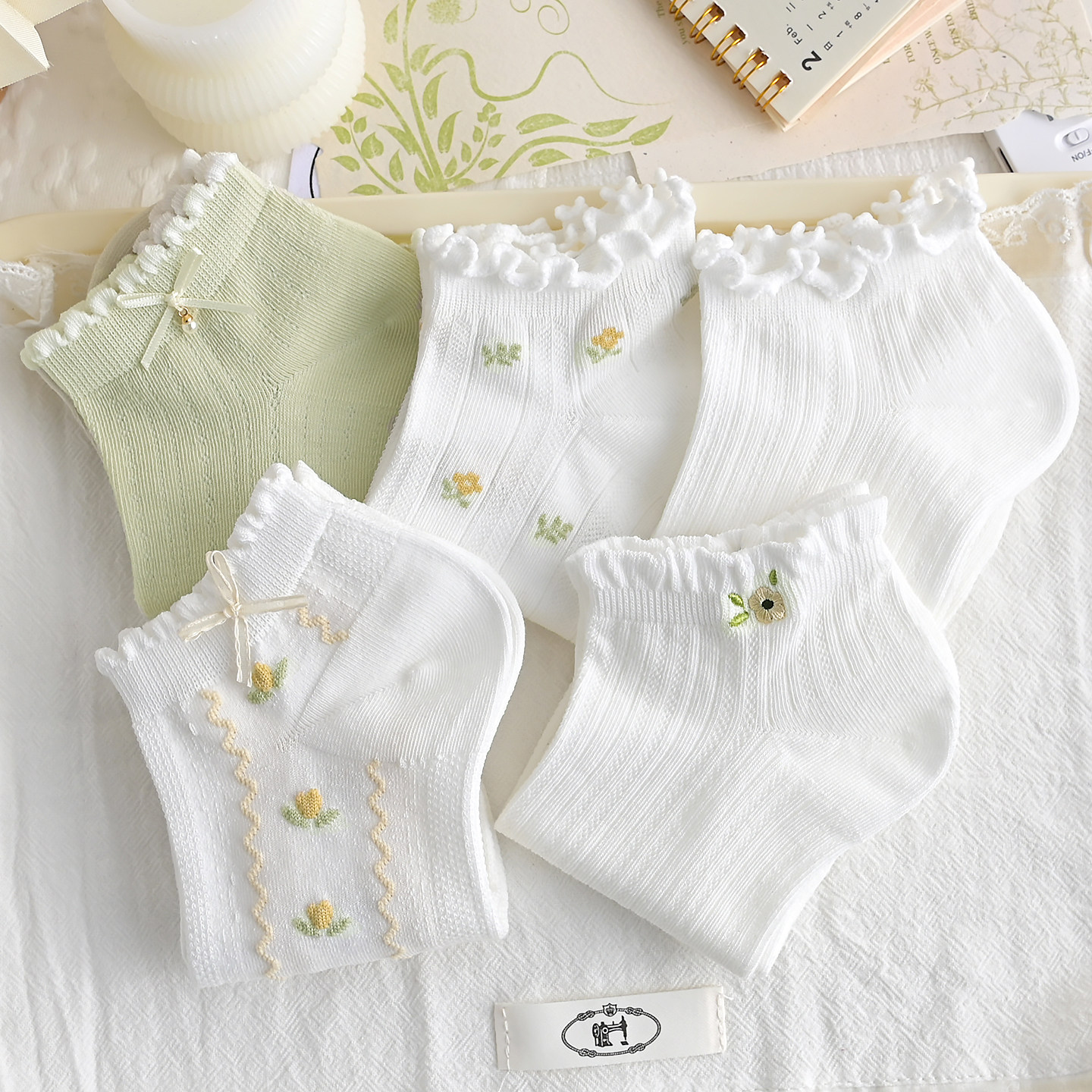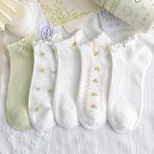 蝴蝶结浅绿色袜子女短袜春夏季 可爱卡通花边刺绣小花女袜 棉袜薄款