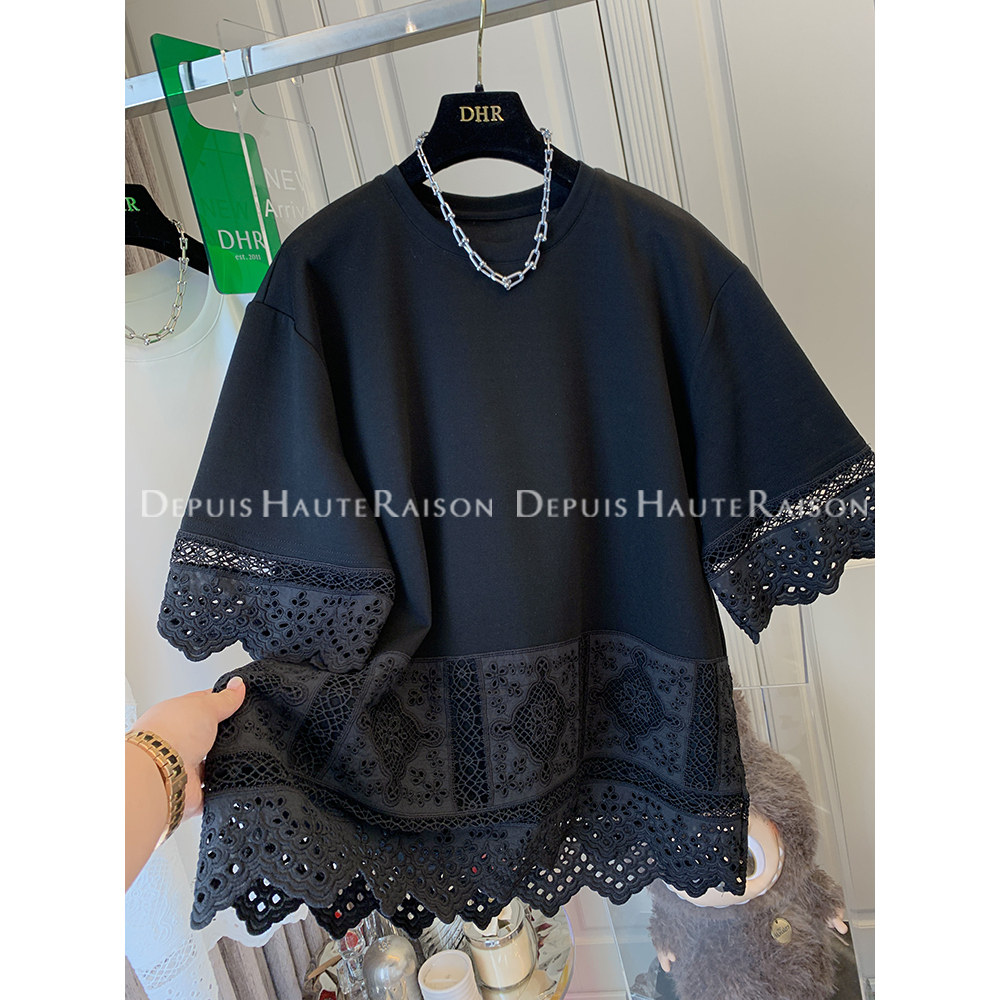 宽松上衣女新款 T恤打底衫 棉 独特漂亮巨好看白色刺绣蕾丝短袖 DHR